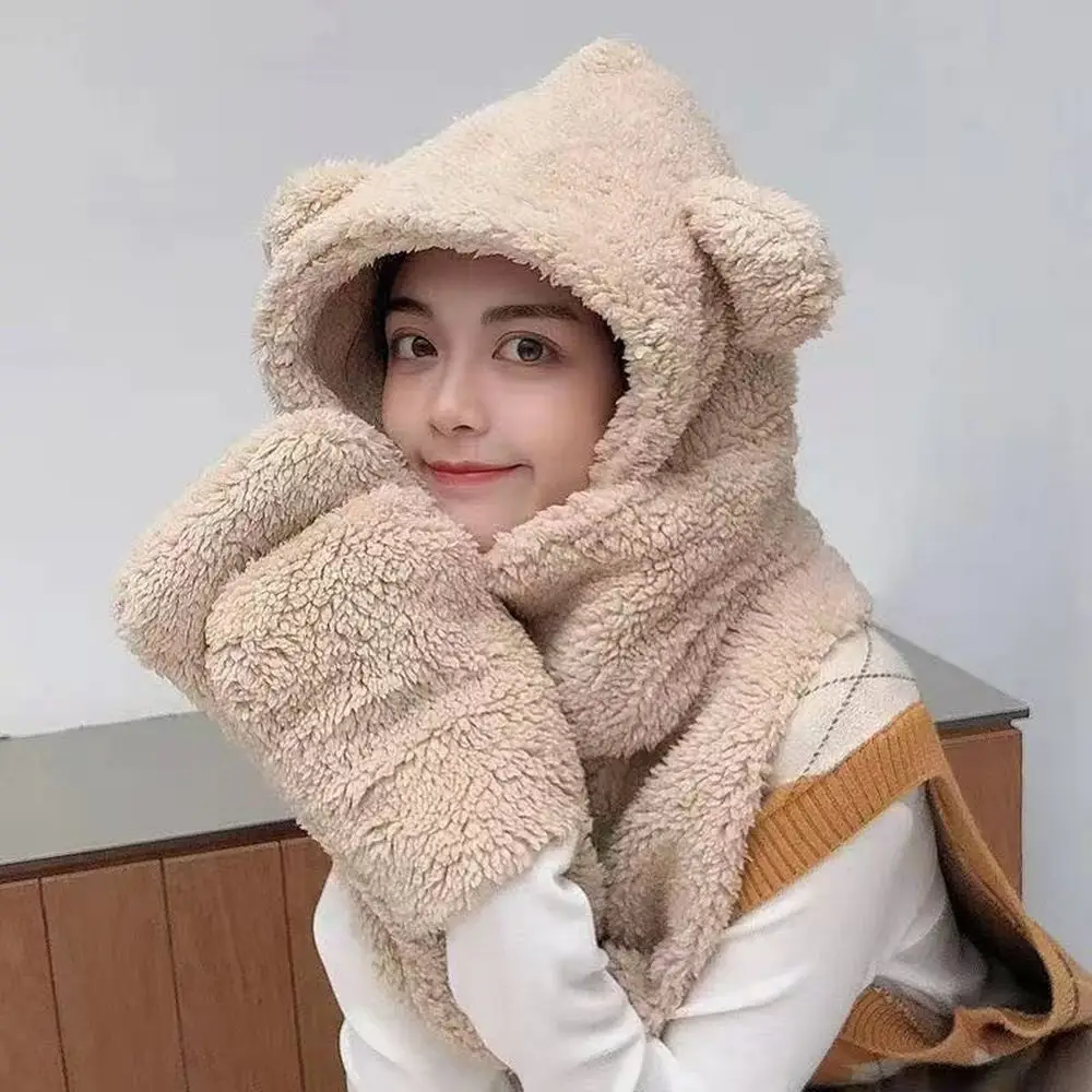 Шапка с ушками милого медведя, женские зимние теплые Новые шапки, повседневная плюшевая шапка, шарф, перчатки, комплект повседневных однотонных флисовых модных аксессуаров для девочек