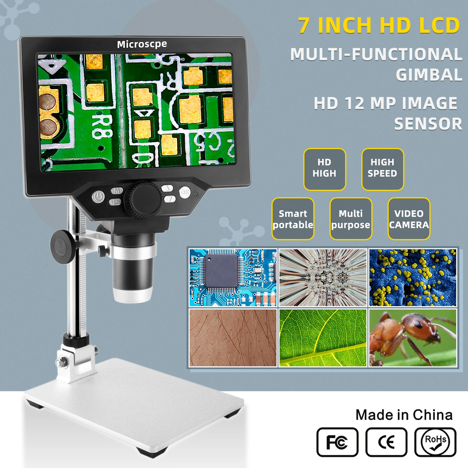 1: пиксель: HD 12 мегапикселей2: Экран дисплея: 7-дюймовый HD ЖК-дисплей.3: увеличение: 1-1200 × система непрерывного усиления.4: расстояние между объектом: от 10 мм до бесконечности (разные расстояния соответствуют разным кратным)5: шестнадцать языковых систем: английский, испанский, русский, корейский, японский, тайский, иврит, Португалия, немецкий, французский, Италия, Турция, чешский, Польша, традиционный китайский, упрощенный китайский.