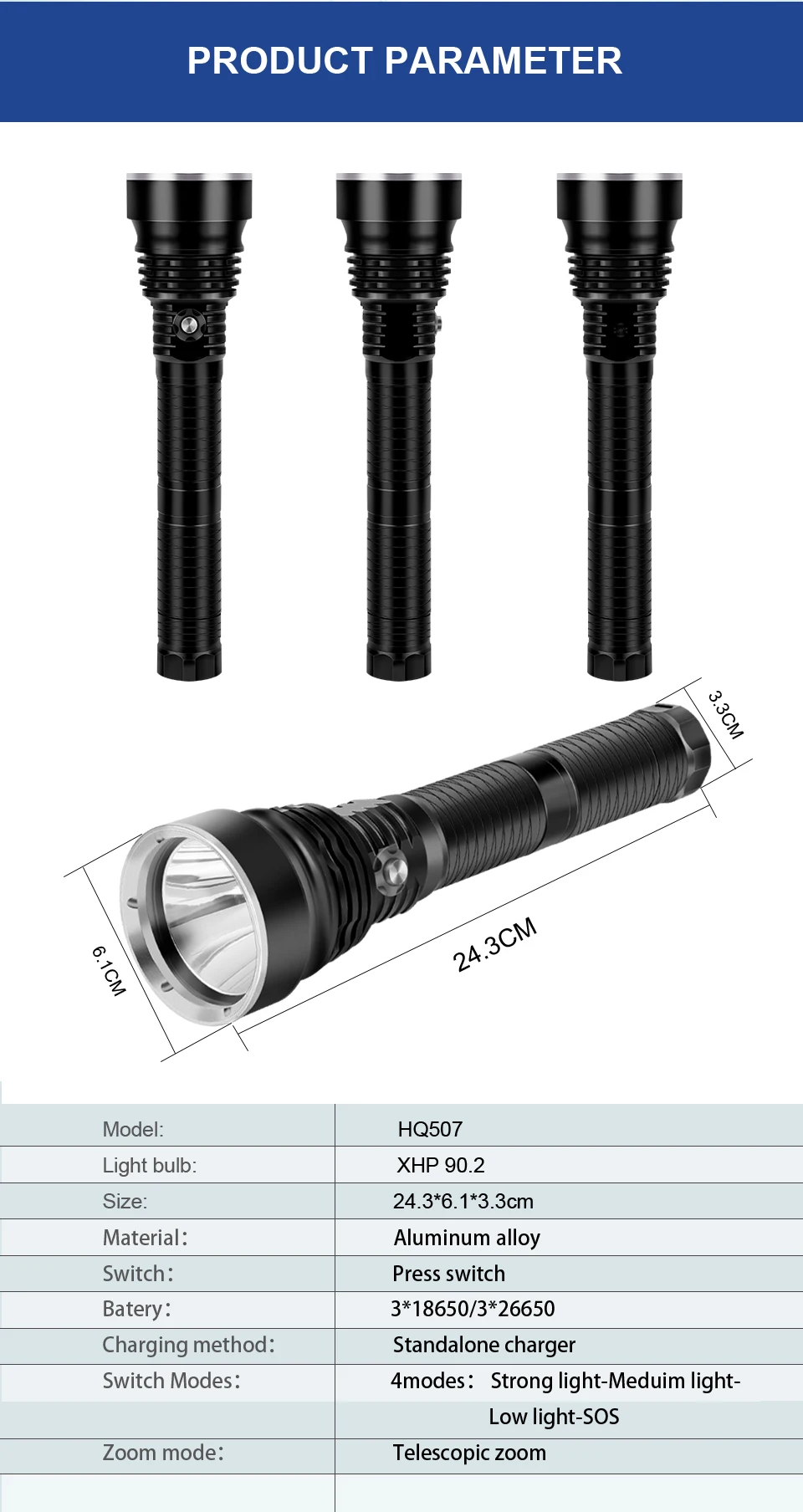 Название: Профессиональный фонарик для дайвинга XHP90.2Модель светодиодных лампочек: XHP90.2 или XHP70Дальность: под водой 300-600 метров.Размер: 31 см * 6 см * 3,1 см (съемный)Режим переключения: 4 режима (высокий-средний-низкий-SOS)Материал корпуса: алюминиевый сплавУровень водонепроницаемости: IPX-8Питание: 3 батареи 26650 или 3 батареи 18650 (2 батареи 18650 или 2 батареи 26650 также обеспечивают правильную работу продукта)Время освещения: аккумулятор 18650 2-4 часа; Аккумулятор 26650: 10-20 часов.Цвет излучения: светильник или желтый светильник