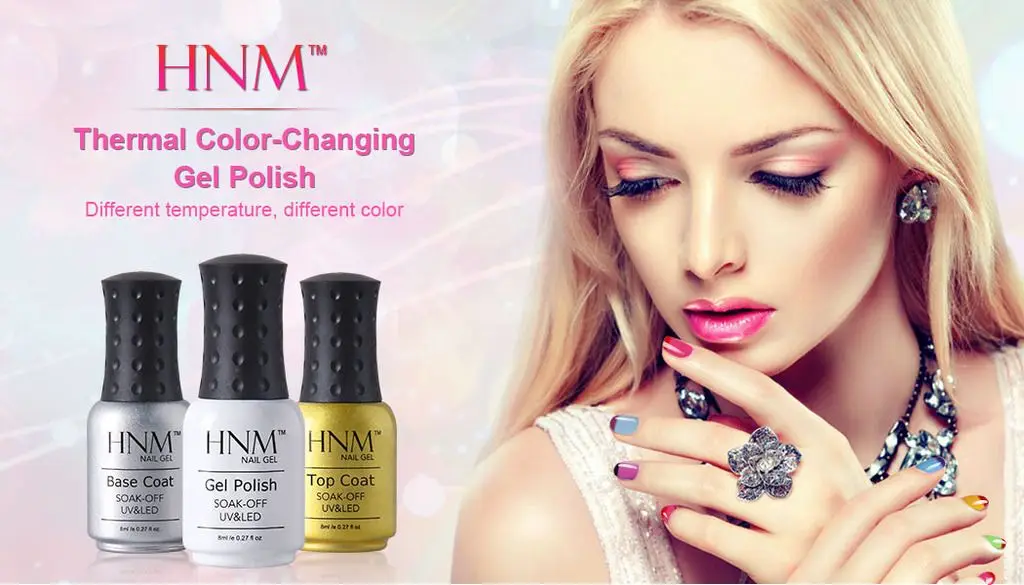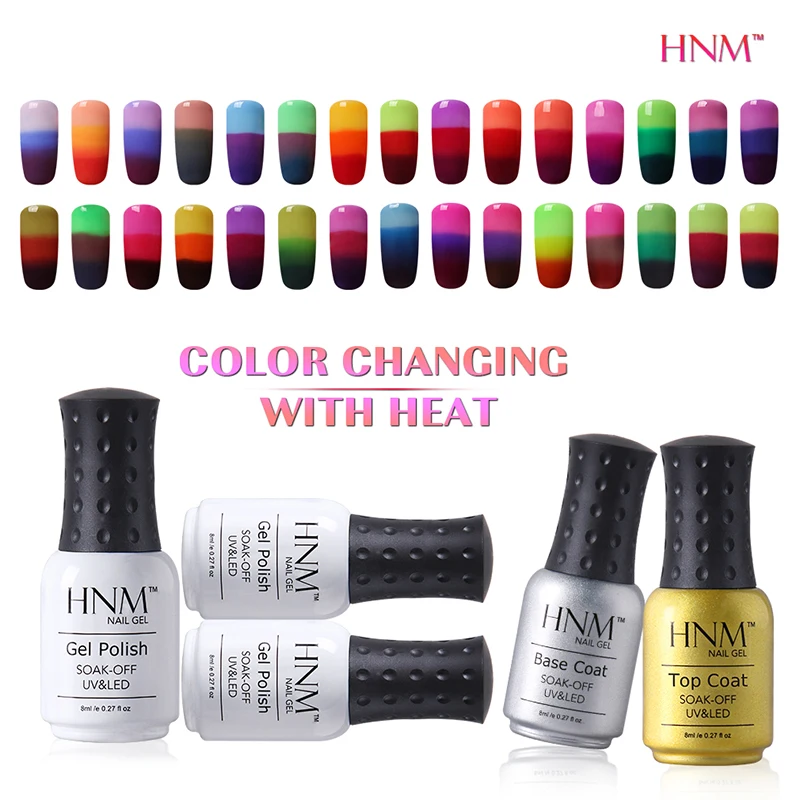 HNM 8 мл Термальность 3 цвета Изменение УФ-гель для ногтей Лаки лак био-Гели Soak Off! Полупостоянная штамповки Краски покрытие для ногтей, полустойкое к Базовая футболка