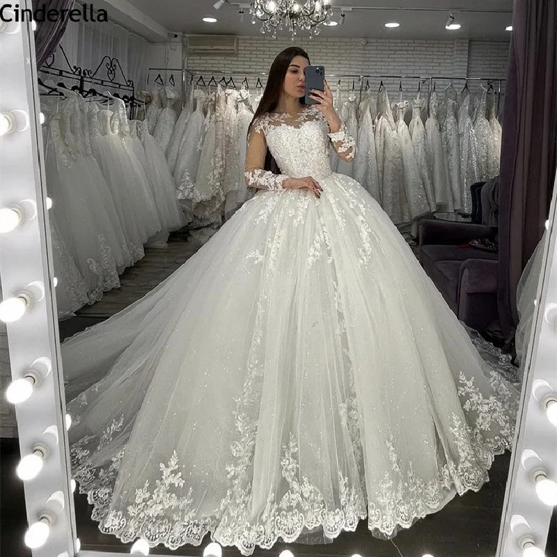 Свадебные платья с длинным рукавом, трапециевидной формы со шлейфом, кружевной аппликацией и кристаллами, свадебные платья со шнуровкой сзади
