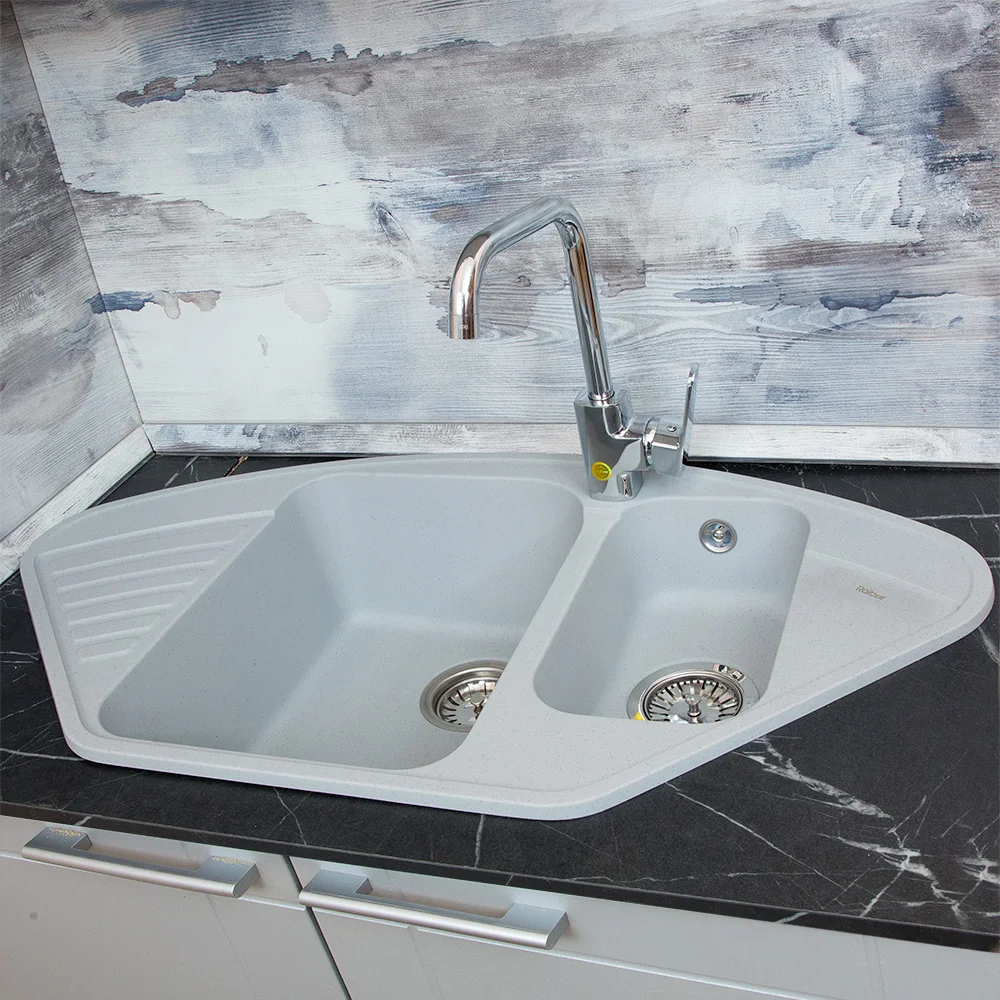 Ударопрочная поверхность кухонный мойки, устойчива к высоким температурам. Для производства продукции используются кристаллы кварца, что делает раковину для кухни эстетичными и максимально долговечными.