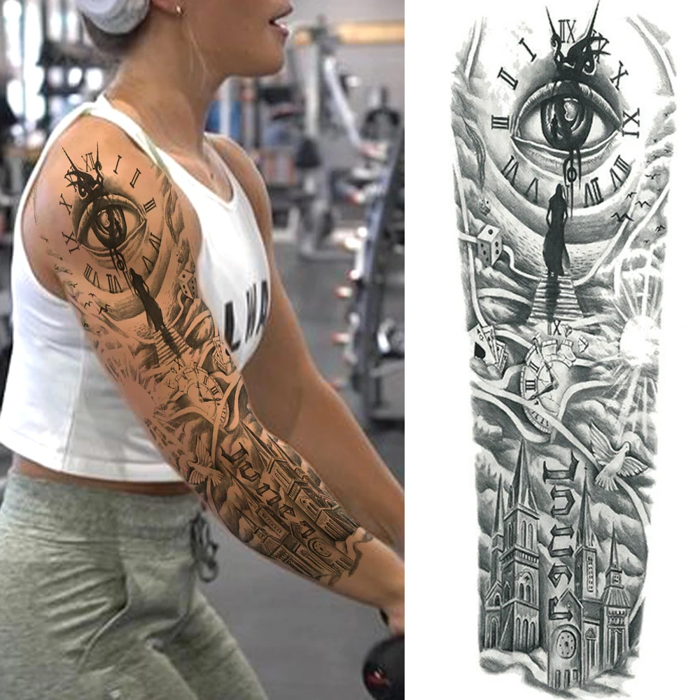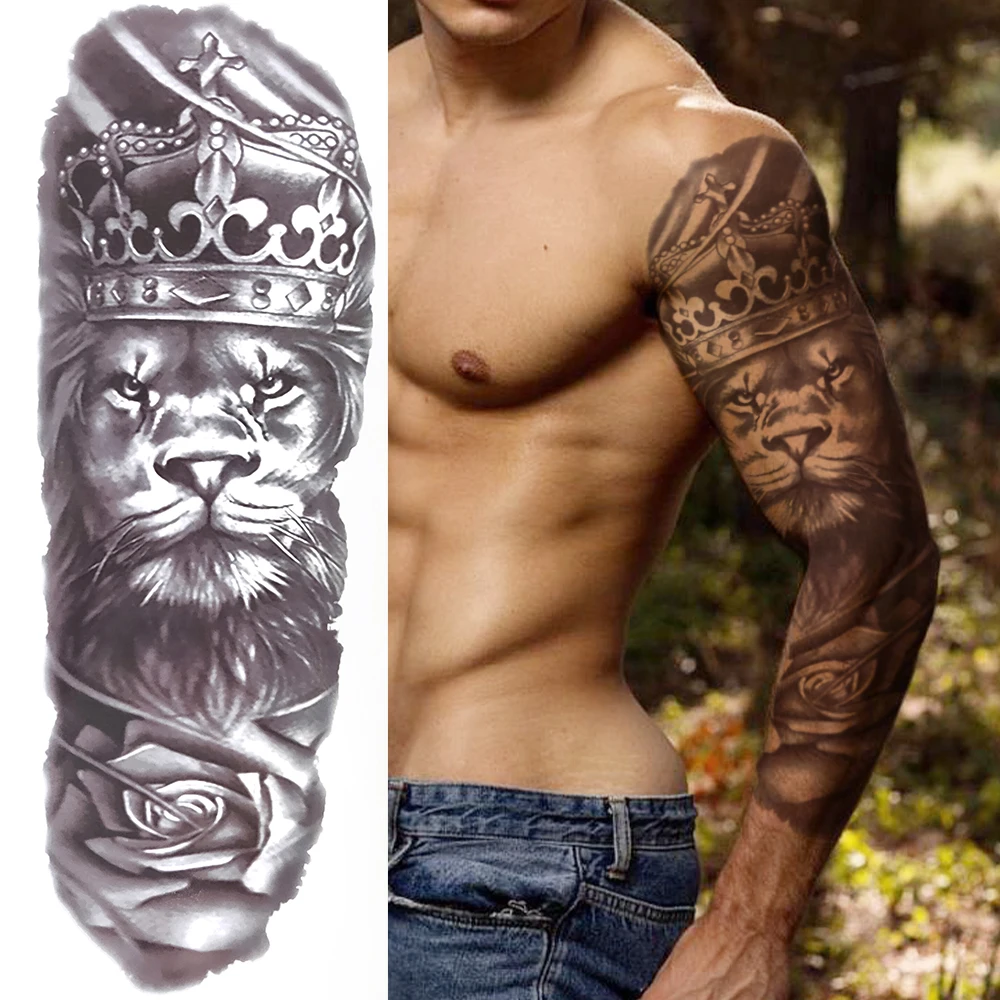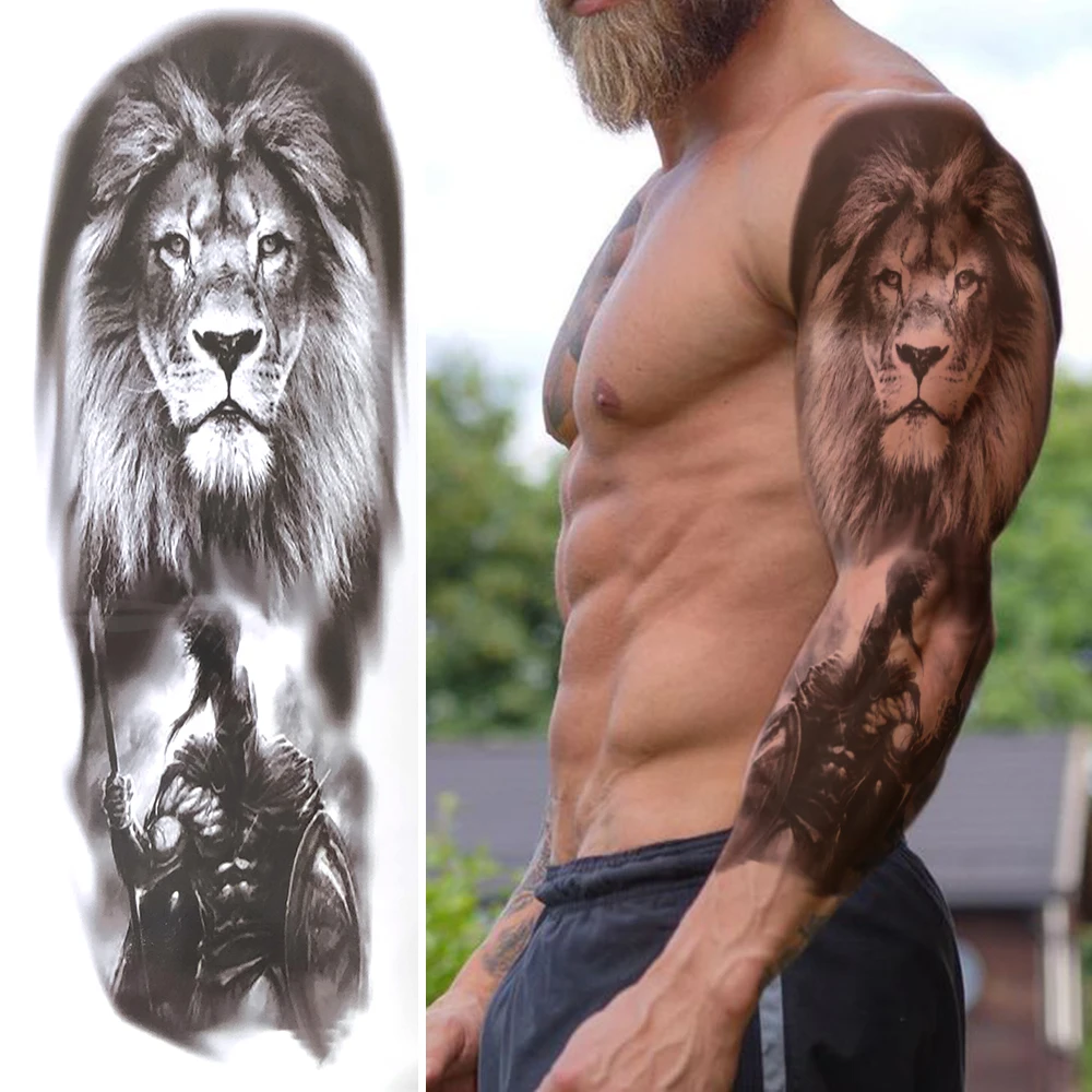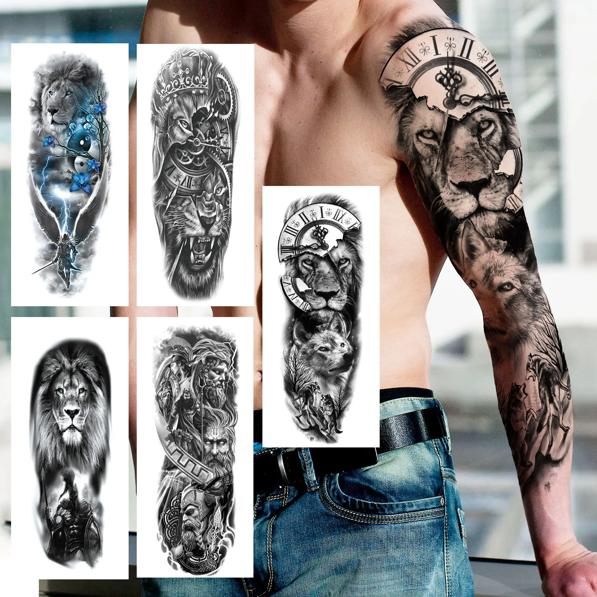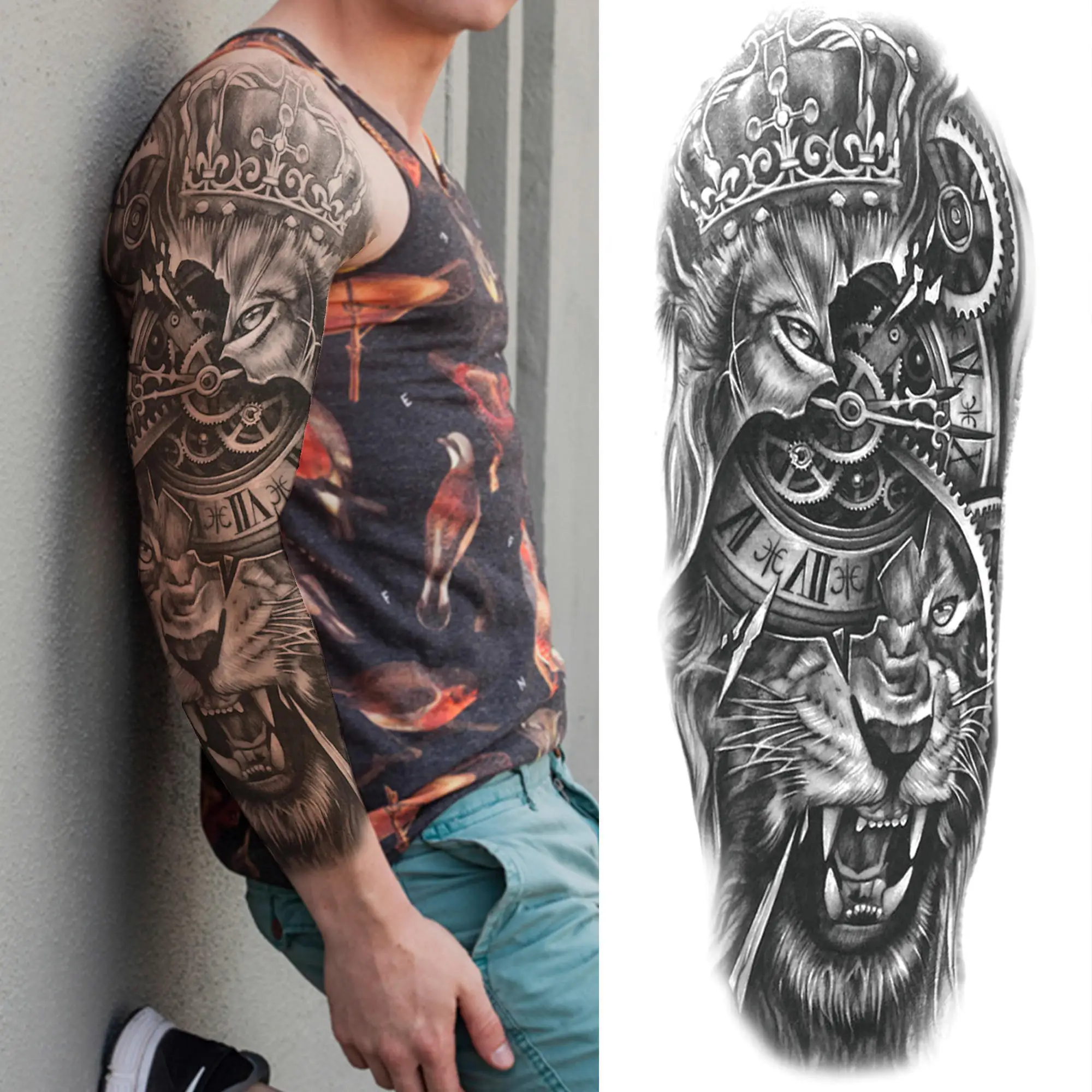 Большой компас, Временный Татуировка рукав льва для мужчин, взрослые, король льва, воин, имитация на всю руку, тату 3D, боди-арт, татуировка, наклейка