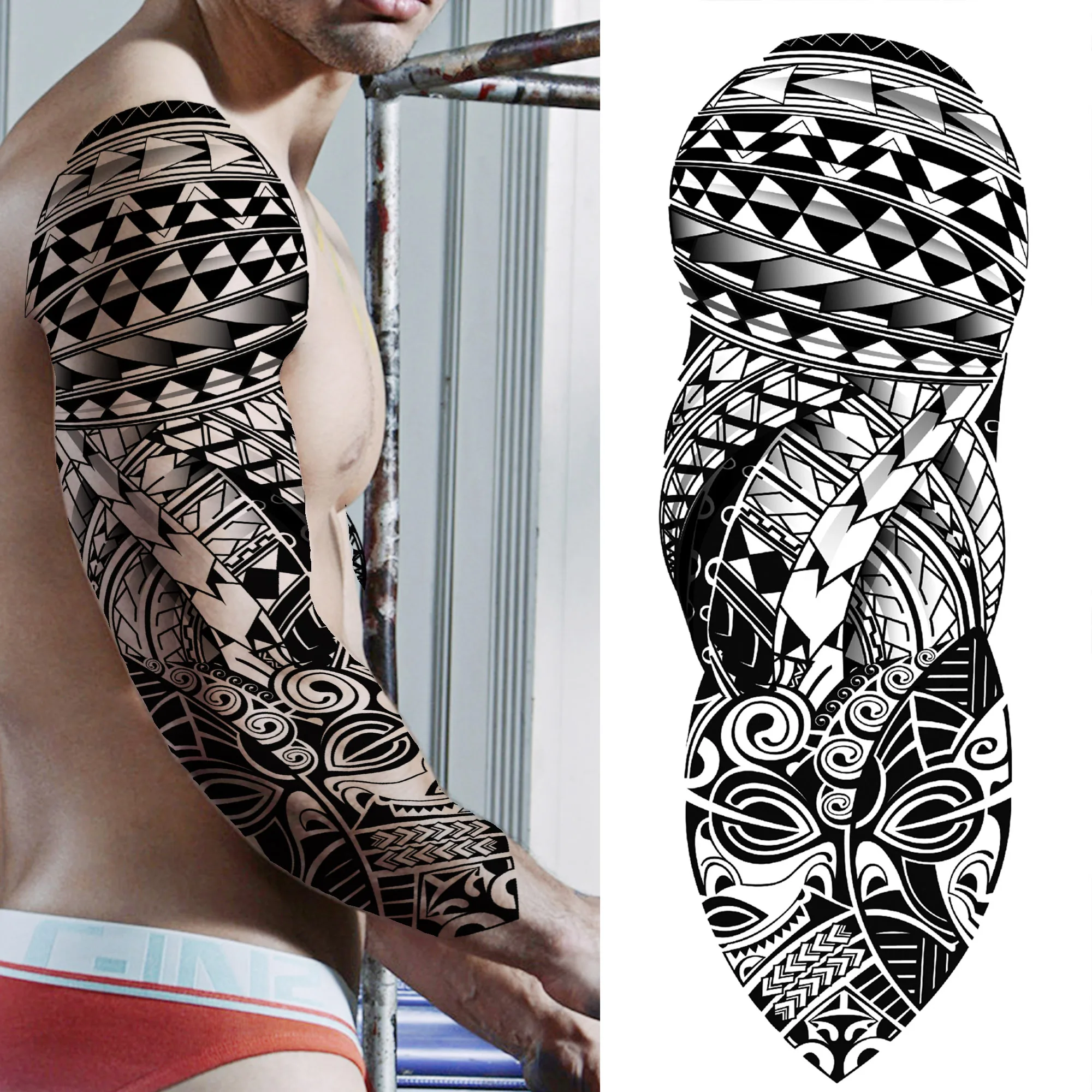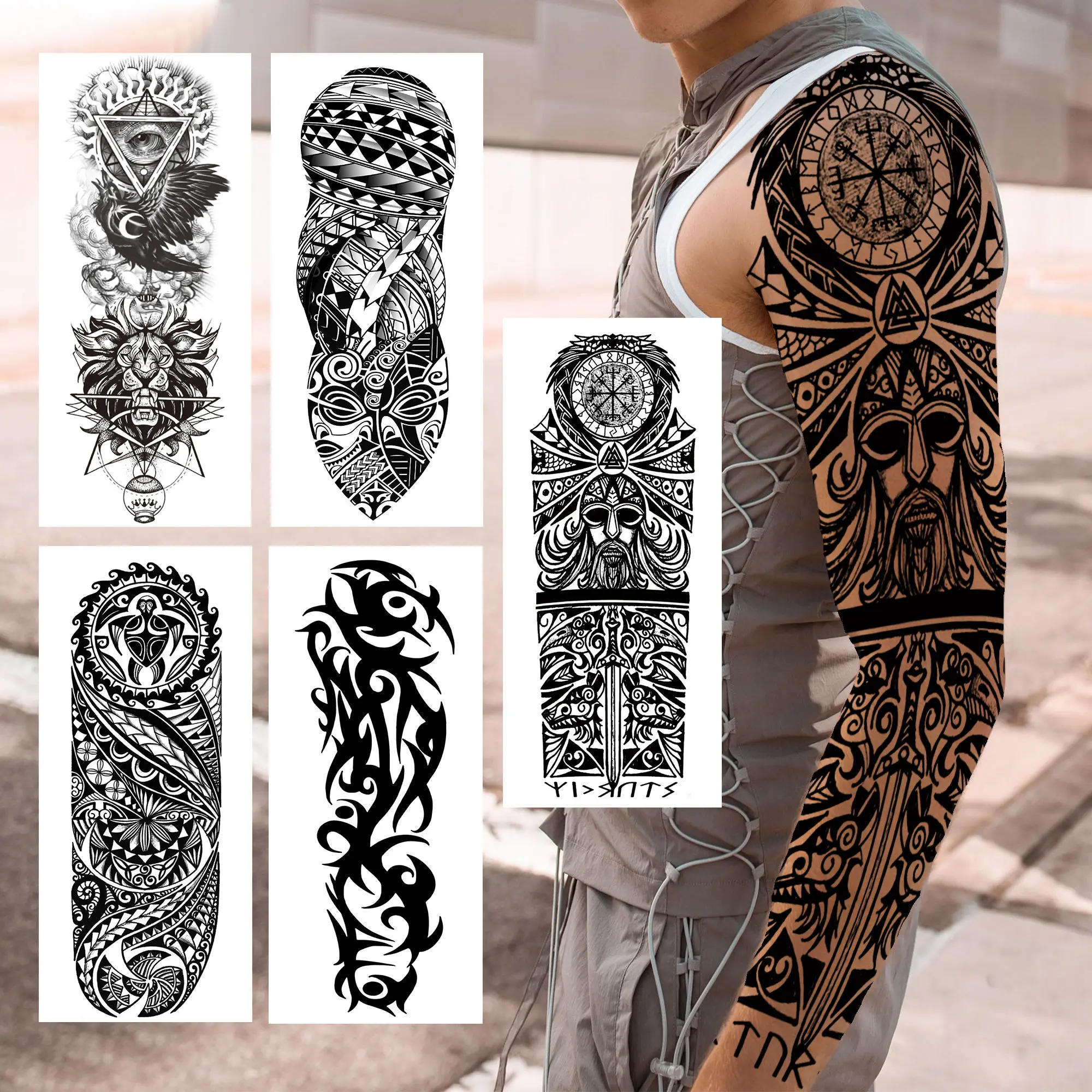 Черный маори Тотем Временные татуировки рукава для Для мужчин взрослых Поддельные черепаха дьявольские глаза Татуировка льва Стикеры Водонепроницаемый полный татуировка на руку