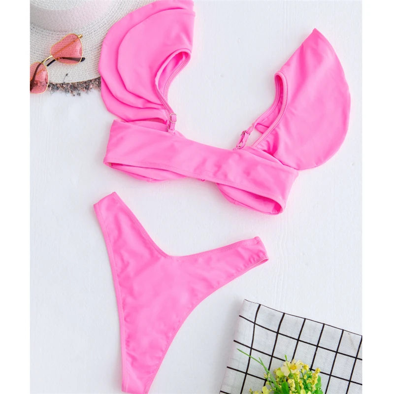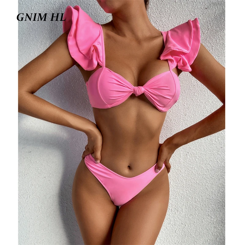 Купальник женский GNIM с оборками, пикантный однотонный бикини с чашками пуш-ап, халтер, купальный костюм из 2 предметов, с высоким вырезом, лето 2021