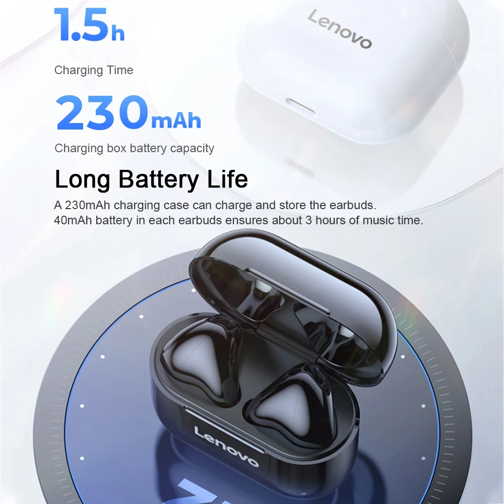 Обзор:Технология BT 5,0 обеспечивает высокую скорость передачи данных, стабильную производительность и низкое энергопотребление. Благодаря технологии TWS вы можете использовать гарнитуру исключительно или использовать их в паре. Оснащен зарядным устройством 230 Ач для хранения и зарядки наушников. Встроенный микрофон обеспечивает более четкий и реалистичный звук. Это принесет вам идеальный пользовательский опыт.Особенности:Технология BT 5,0 обеспечивает более высокую скорость передачи данных, более стабильное и быстрое подключение и низкое энергопотребление.Настоящая беспроводная конструкция с двумя ушами, левый и правый каналы наушников разделены. Его можно использовать исключительно или парами.Конструкция сенсорного управления, больше никакого давления на уши. Легко управлять музыкой и звонками, а также активировать голосовой помощник.Встроенный микрофон на обоих наушниках с интеллектуальным шумоподавлением обеспечивает более четкий звук разговора в стереорежиме.Зарядный чехол емкостью 230 мАч может заряжать и хранить наушники. Аккумулятор емкостью 40 мА · ч в каждом наушнике обеспечивает около 3 часов воспроизведения музыки.Характеристики:Название бренда: LenovoНомер модели: LP40Версия BT: 5,0Расстояние передачи: до 10 м (без препятствий)Диаметр привода: 13 ммЧастотный диапазон: 20-20 кГцЧувствительность динамика: 98дБЧувствительность микрофона: -32 дБ ± 3 дБСопротивление: 32 ОмЗарядный чехол Батарея Ёмкость: 3,7 V 230mAhНаушники Батарея Ёмкость (каждый): 3,7 V 40 мА * чВремя воспроизведения музыки: около 3 часов (зависит от громкости музыки)Цвет: черный, белый (по желанию)Вкладыши Вес (каждый): 3,2g/0,11 ozРазмер посылка: 8,7*8,7*2,8 см/3,42*3,42*1,10 унцийВес посылка: 64 г/2,25 унцийПосылка:1 * пара наушников1 * чехол для зарядки1 * зарядный кабель1 * Руководство пользователя (английский/китайский)