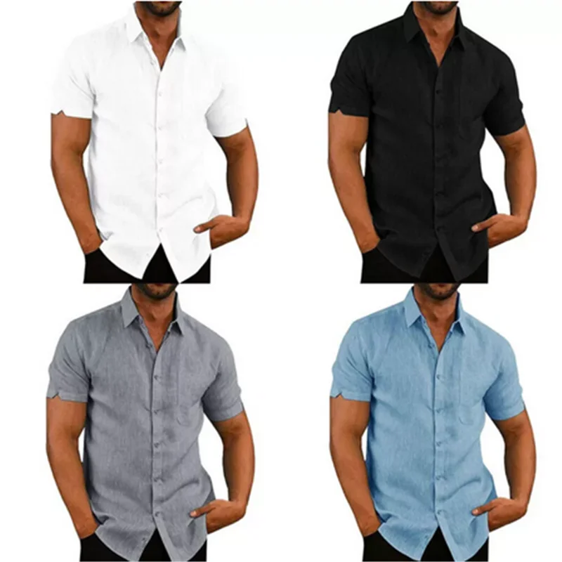 Рубашка Мужская льняная с коротким рукавом, свободная Повседневная блуза из чистого хлопка и льна, на пуговицах, однотонная Удобная футболка для отдыха, лето