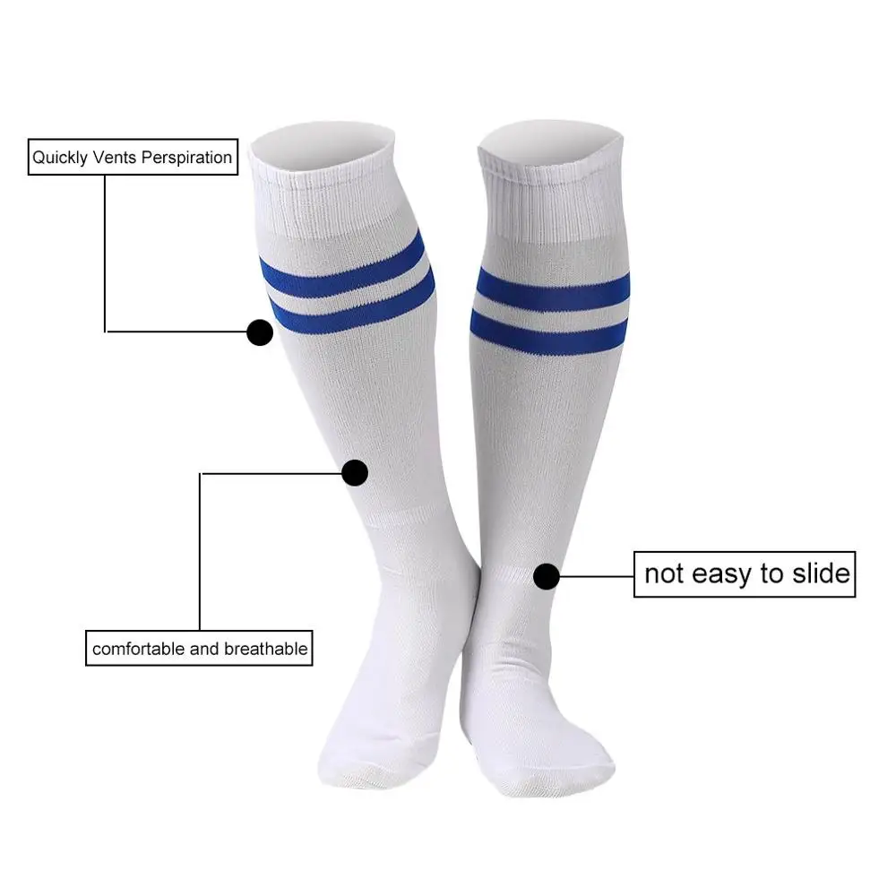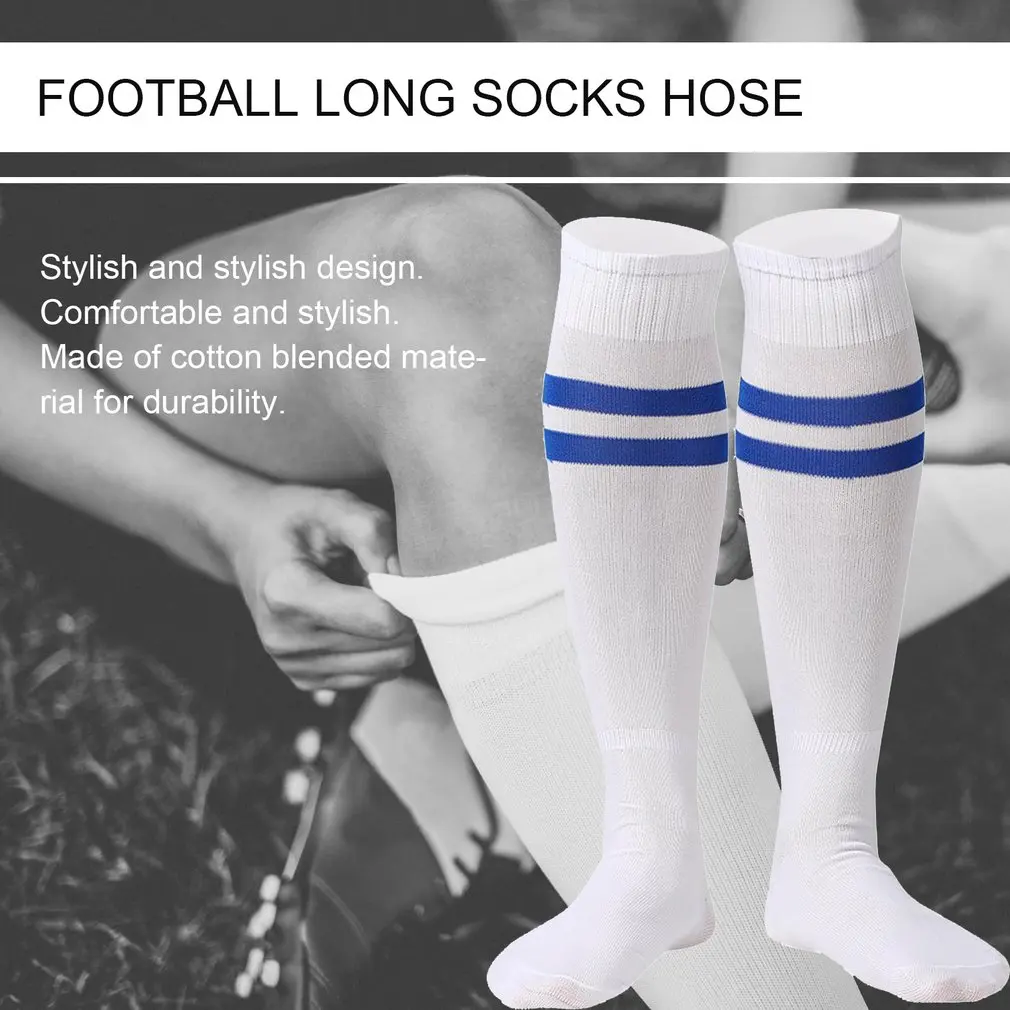 Особенности:Подходит для четырех сезонов.Изготовлен из высококачественного хлопкового материала.Модный и стильный дизайн.Удобные и модные.Изготовлен из хлопка, очень прочный для использования.Описание:Подходит для игры в бейсбол, футбол, баскетбол, спорт.Характеристики:Материал: смесь хлопкаЦвет: черный, синий, желтый, красный, зеленый, белыйДлина: 54 смУзор: в полоскуСтиль: до коленаПосылка включает в себя:2 х футбольные длинные чулки шланги(Есть небольшие различия в размерах носков,