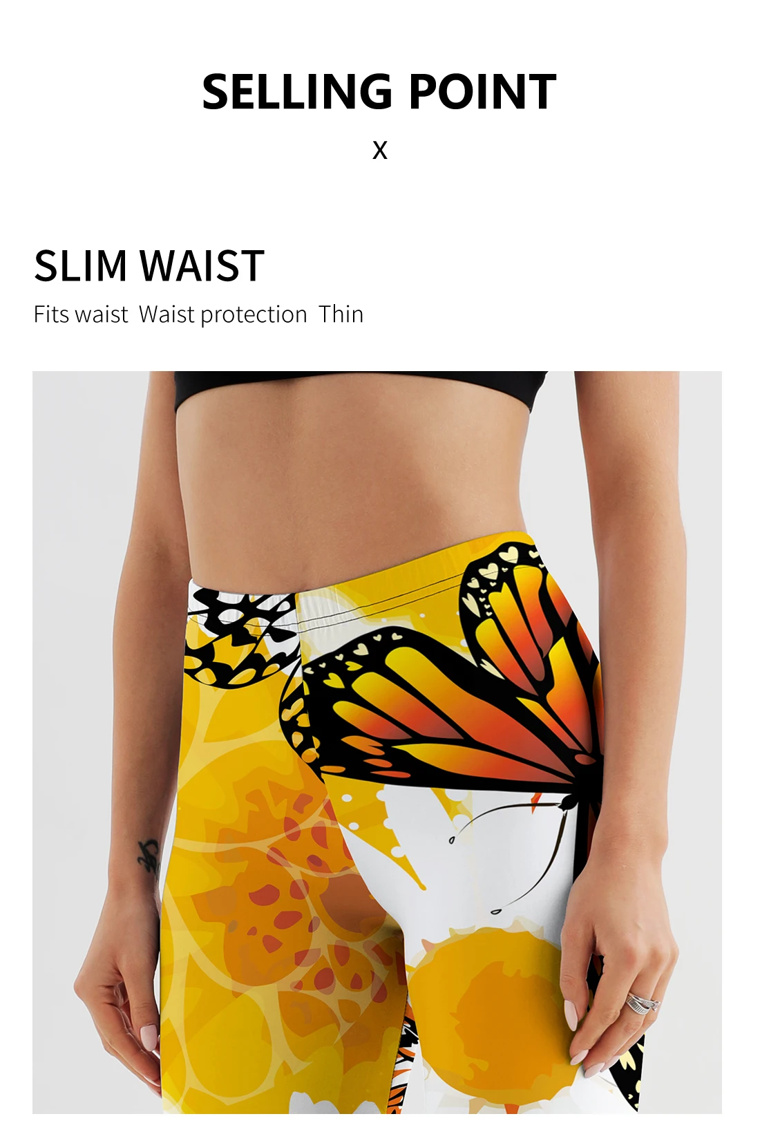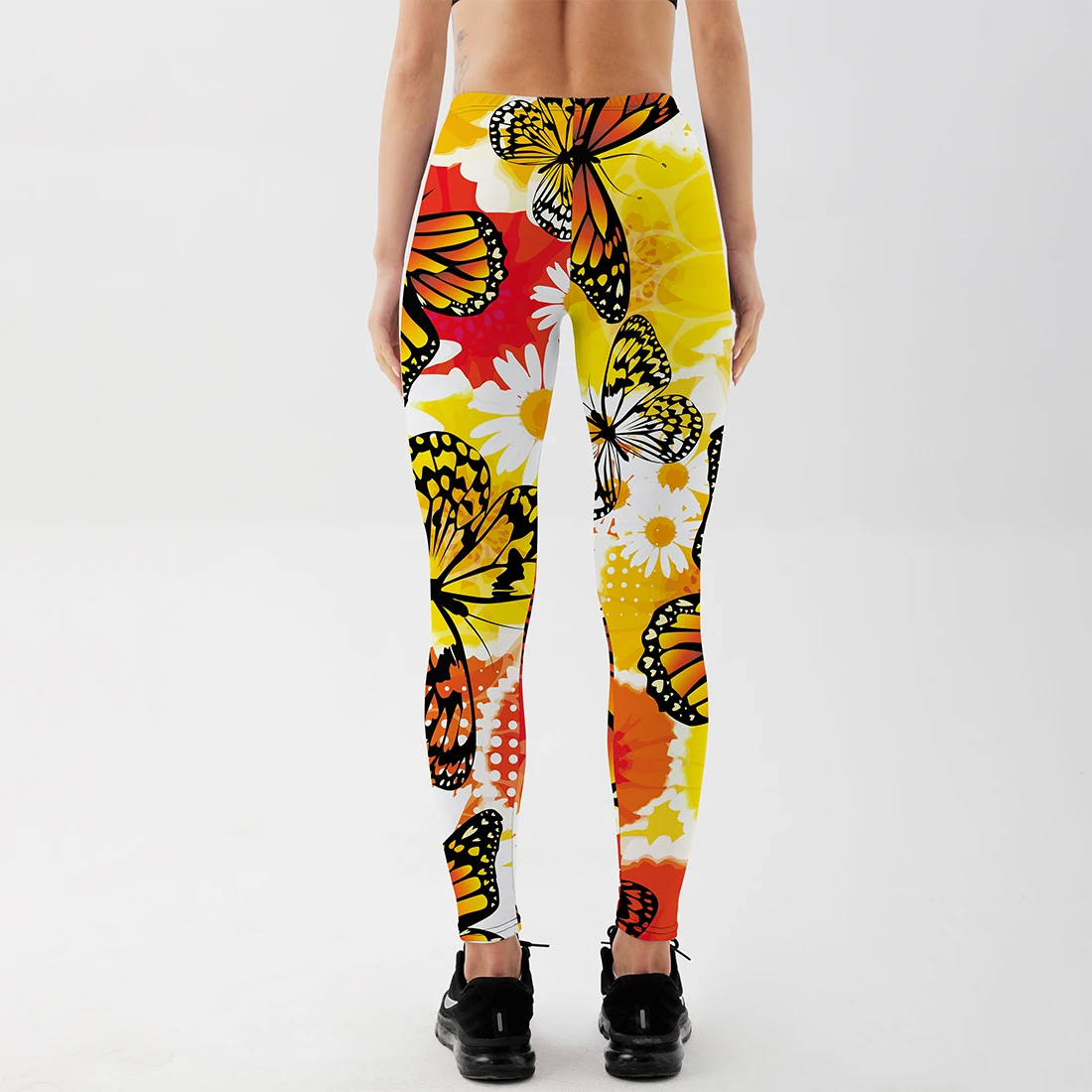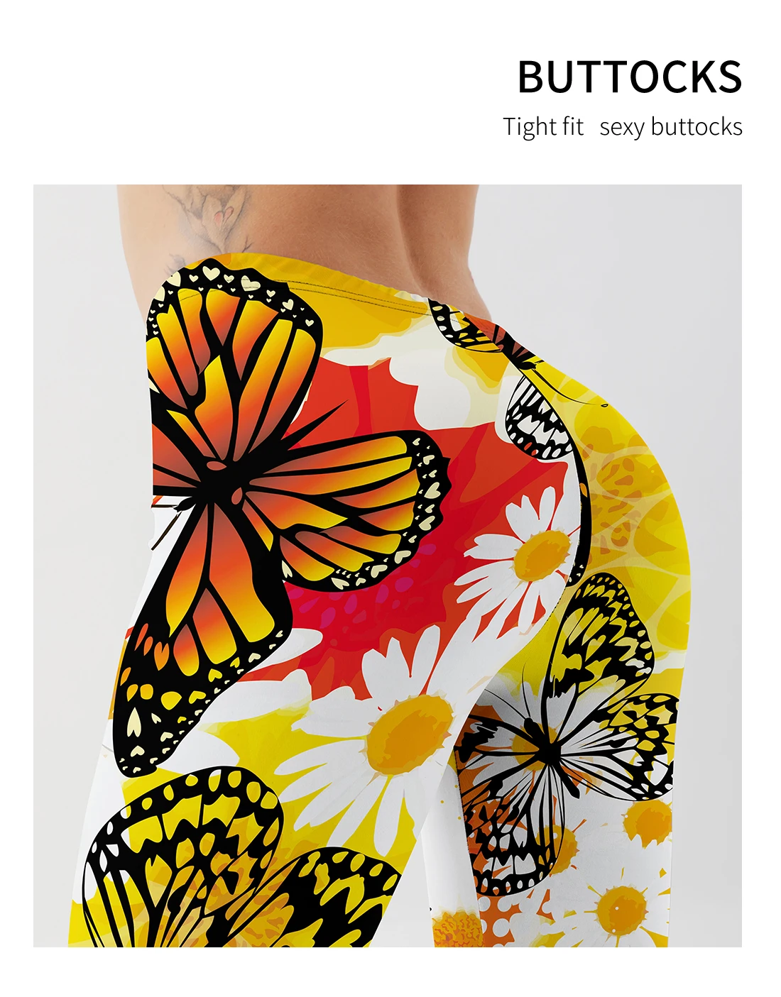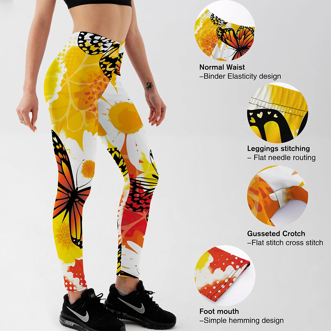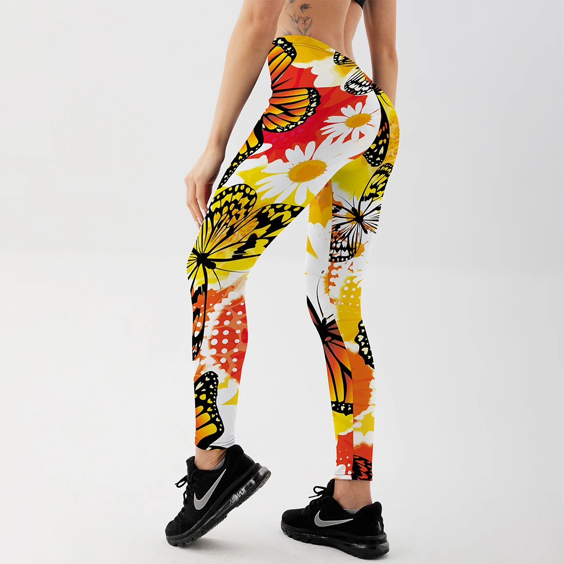 Женские легинсы с желтыми бабочками и цветочным принтом, повседневные длинные легинсы для фитнеса и тренировок