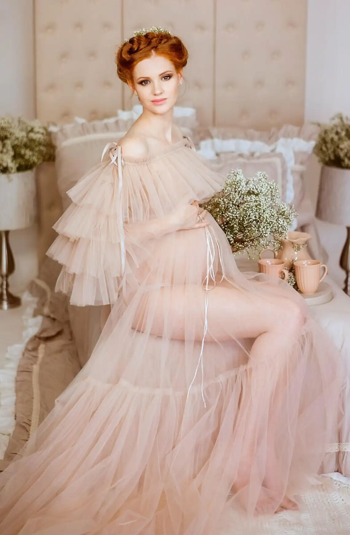 Соблазнительные тюлевые халаты для беременных прозрачные гофрирован...