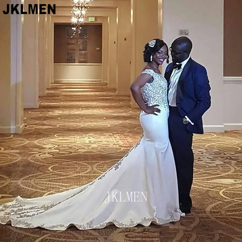 Русалка свадебное приемное платье атласная Золотая аппликация с открытыми плечами Труба Свадебное платье CT029