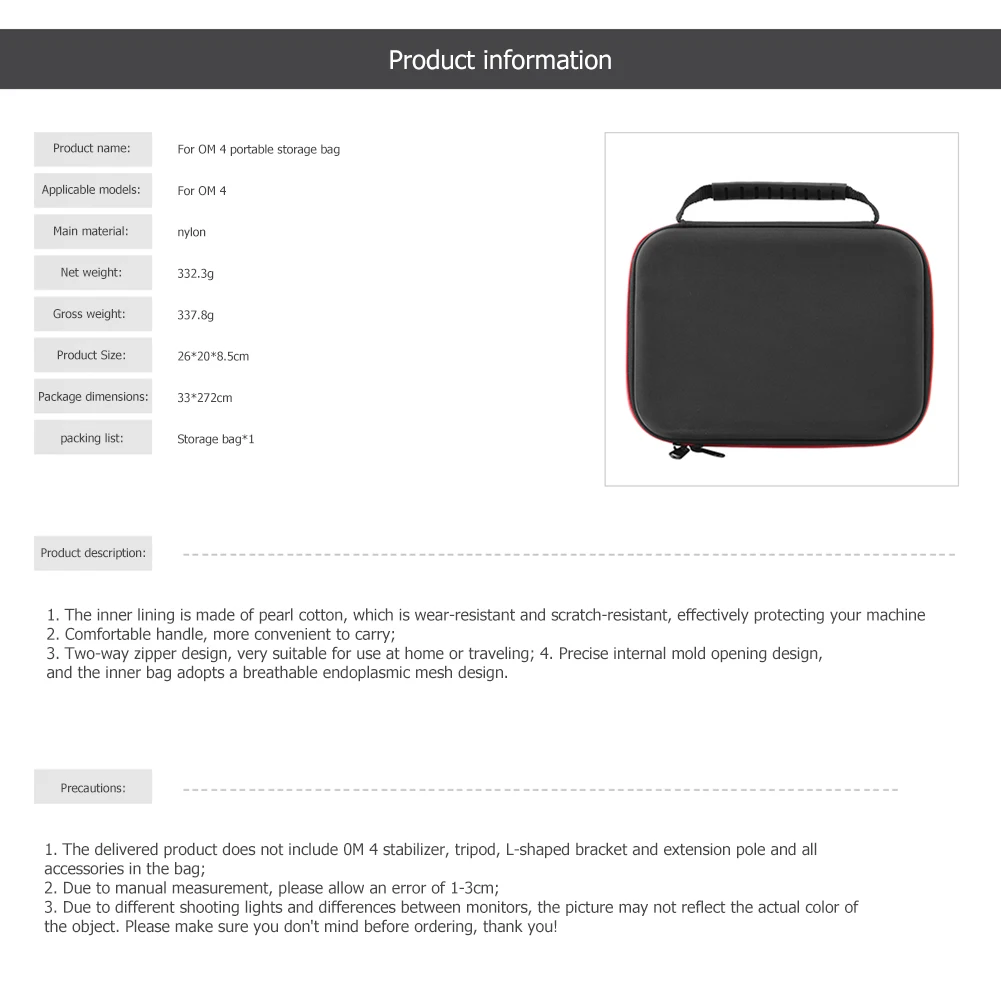 1. Не включает стабилизатор карданного шарнира для OM 4, штатива, l-образного кронштейна, удлинителя и всех аксессуаров в сумке.