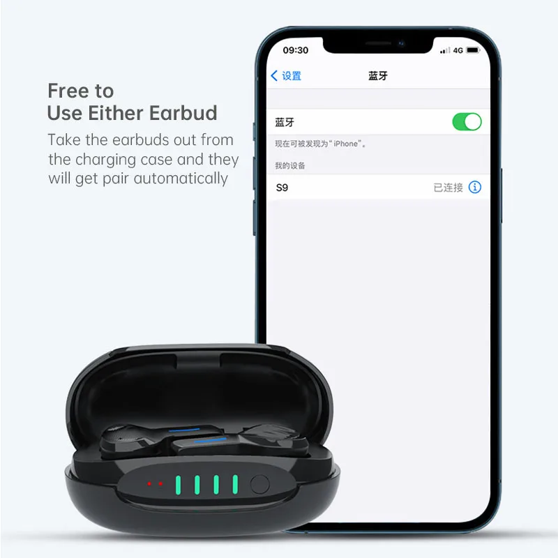 Возьмите наушники из зарядный чехол и они получат пара автоматически найдите пункт «S9 "в мобильный телефон Bluetooth настройки, чтобы подключить его к наушники.