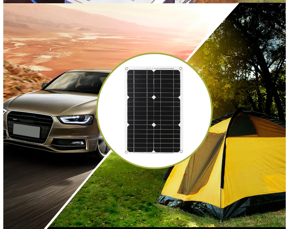 Особенности:Комплект солнечной панели-монокристаллическая солнечная панель и экологическая ПЭТ-пленка, безопасна для использования с долгим сроком службы. Защита окружающей среды солнечная энергия, безбилетная и удобная.Портативный дизайн-небольшой размер и легкий, его легко носить с собой для кемпинга или других видов активного отдыха. Легко установить с помощью предварительно просверленные отверстия на задней панели для быстрой установки и сохранности таких материалов.Подключи и играй --- встроенный usb-порт в панели солнечных батарей, поставляется с 4 видами кабеля, подходит для большинства видов устройств, подключи и играй, избегайте непредвиденного отключения питания.Водонепроницаемый --- подача заявки на продвинутый уровень воды и пыли, полная защита от частиц окружающей среды и струй низкого давления.Широкое применение-широко применяется для системы зарядки аккумулятора вне сети 5/12 вольт и различных приложений постоянного тока, включая караван, фургон, автомобиль, лодка, зеленый дом, морской, сухой Кемпинг, Полив сада, сарай, кабины, ворот и т. д. Технические характеристики:Материал: ПЭТЦвет: черный и белыйПанель: панель солнечной батареи из монокристаллического кремнияСилы: 180 Вт (макс.)Выход постоянного тока: 12V 2.5AНапряжение на выходе USB: 5В 1.7AЭффективность преобразования: 20%Защита от скорость передачи данных: IP65Вес товара: 452g/15,9 ozРазмер панели: 420*280 мм/16,54*11,02 дюйма КонтроллерМатериал: АБС-пластикЦвет: черный и синийНапряжение: 12V/24V/48V (Авто)Зарядный ток никель-металл: 10-100AТок на выходе: 10-100AМакс солнечная Входная сила по уровню поверхности: <с алюминиевой крышкой, 50ВПлавающее напряжение заряда: 13,7 V (defaul, регулируемый)Разряда стоп напряжения: 10,7 V (defaul, регулируемый)Разряда восстановить напряжения: 12,6 V (defaul, регулируемый)Само-потребляют по уровню поверхности: <10mAНапряжение на выходе USB: 5В 3A порты USBРабочая температура: -35 ℃ до 60 ℃Вес товара: 128g/4,52 ozРазмер товара: 133*70*31 мм/5,5*2,76 * 1.22in В комплект входит:1 * Панель солнечных батарей1 * автомобильным зарядным кабелем1 * кабель с зажимом1 * DC кабель для зарядки1 * DC адаптер для зарядного кабеля