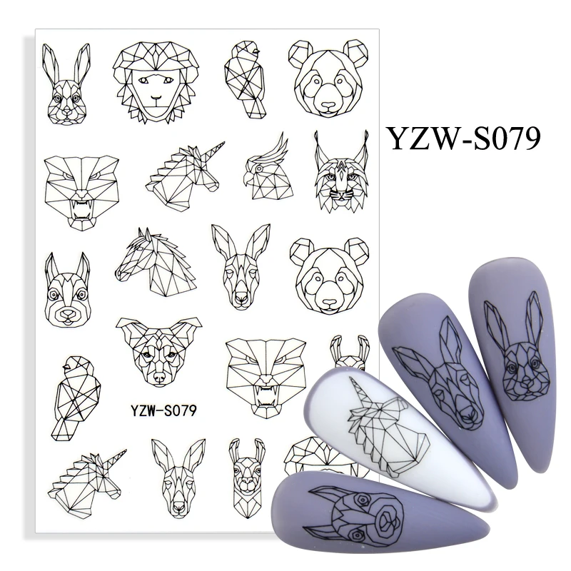 3D Черные Животные геометрические наклейки для ногтей олень лиса св...