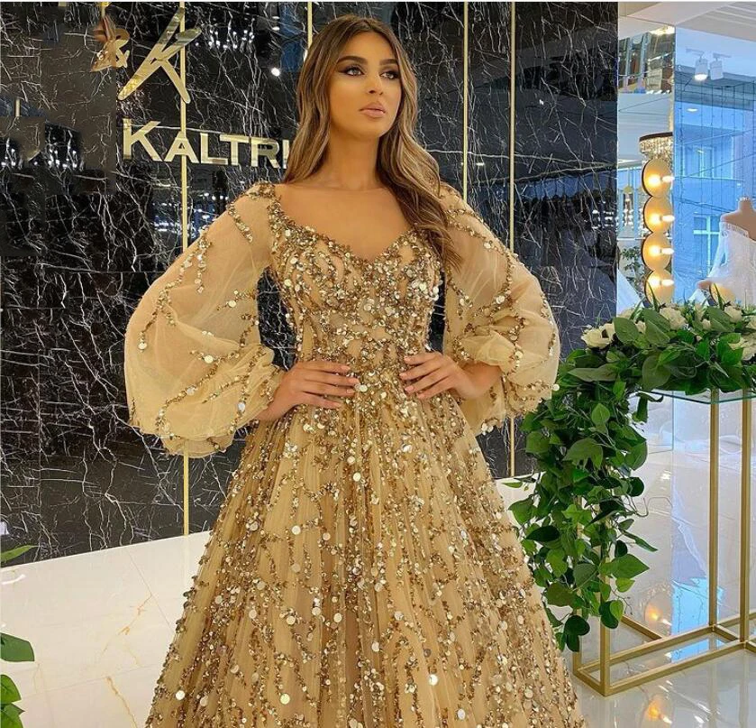 Великолепные вечерние платья Дубаи с блестками и бусинами, золотые пышные рукава, блестящее Сетчатое официальное вечернее платье, платья для вечеринок, Саудовский, арабский