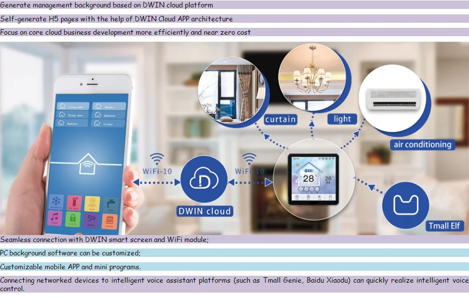 DWIN стремится предоставить клиентам отрасли более удобную и простую в эксплуатации вторичную платформу для развития, чтобы помочь клиентам повысить эффективность исследований и разработок. Для того, чтобы помочь пользователям лучше выполнять дистанционное управление и управление данными, еще в 2018 году, DWIN официально запустил облачную платформу развития. Опираясь на свою собственную зрелую систему взаимодействия человека и компьютера, DWIN разработала инновационное и эффективное умное решение IoT. Пользователи могут: