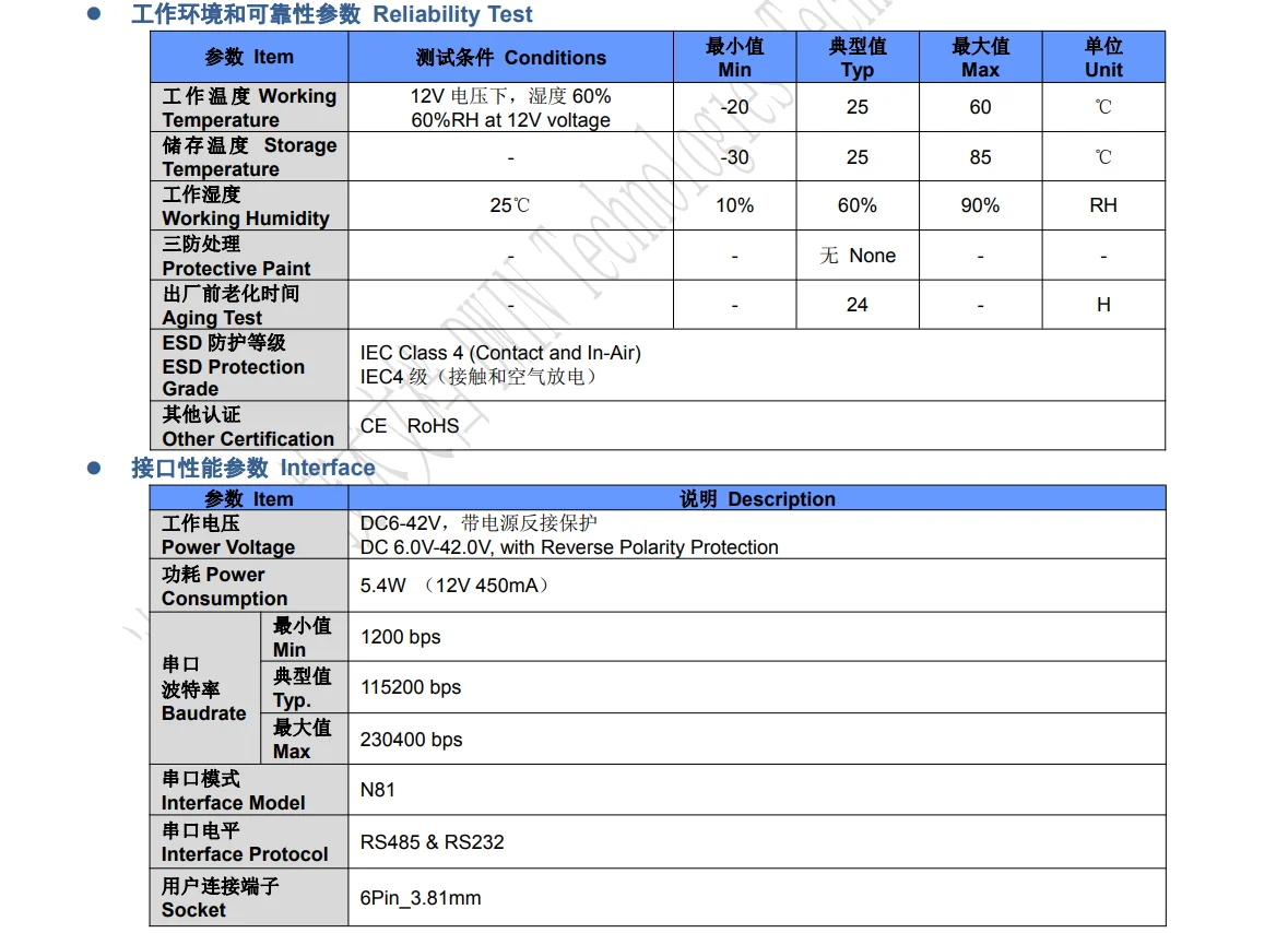 -20 ℃ ~ 70 ℃ (12V @ 60% RH)