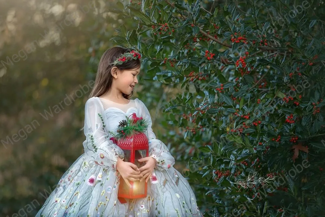Садовые цветы, Аппликации, трапециевидная иллюзия, фантазийное, прозрачное, с рукавами фонариками, детское платье для дня рождения