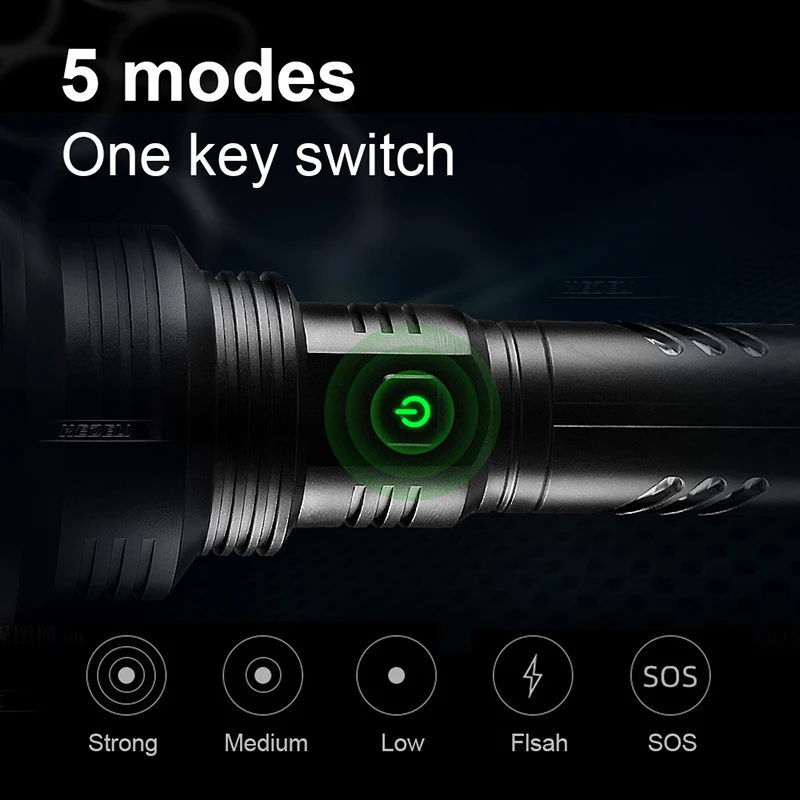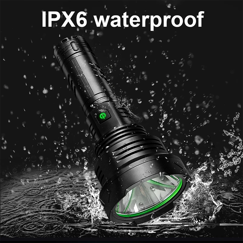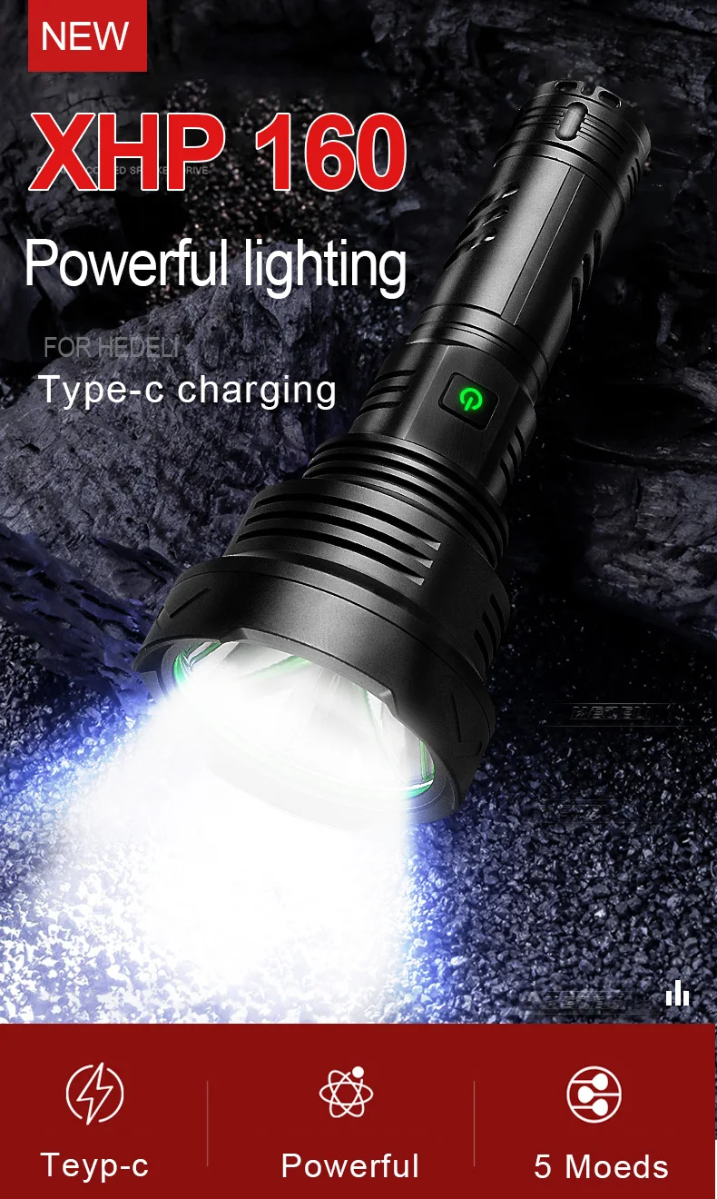 1: супер XHP160 фитиль, яркость выше вашего воображения.2: Может использоваться как Мобильный банк питания для зарядки мобильных телефонов.3: IPX6 Водонепроницаемый, может использоваться в дождливые дни.4: продукт с интеллектуальным контролем температуры и Предупреждение о низком напряжении, высота от падения до 2 метров.