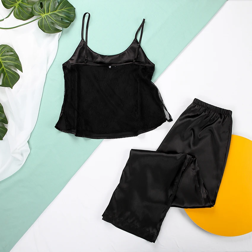 Пижама женская, атласная, черная, кружевная, со штанами, на тонких ...