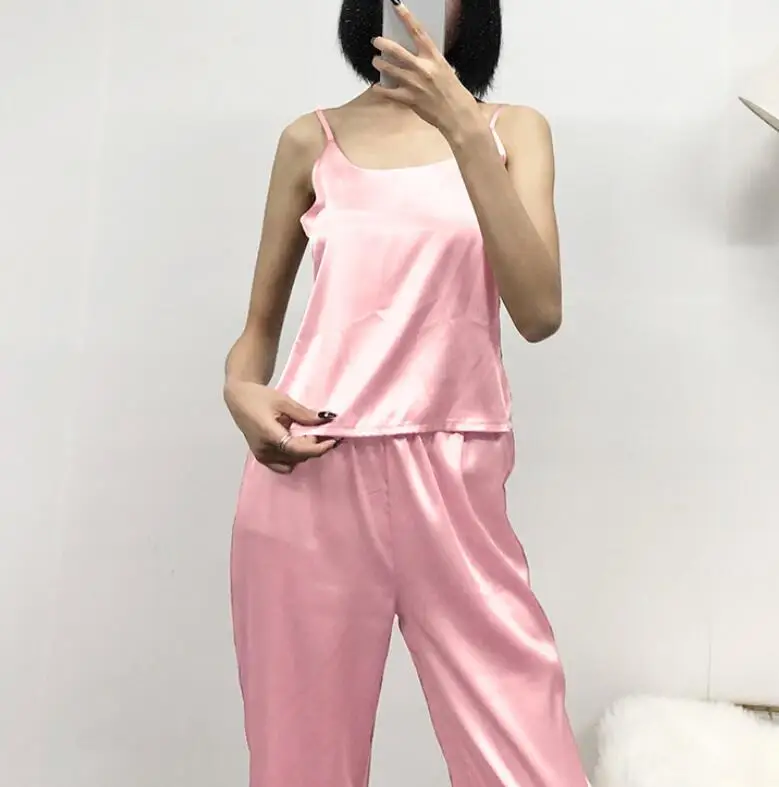 Пижама женская атласная с открытой спиной, кружевной пижамный комплект со штанами, свободное нижнее белье на бретелях-спагетти