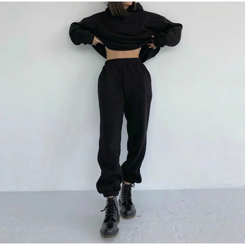 Женские Элегантные однотонные комплекты, женские теплые толстовки с капюшоном и длинные штаны, модные комплекты из 2 предметов, костюмы с толстовкой большого размера