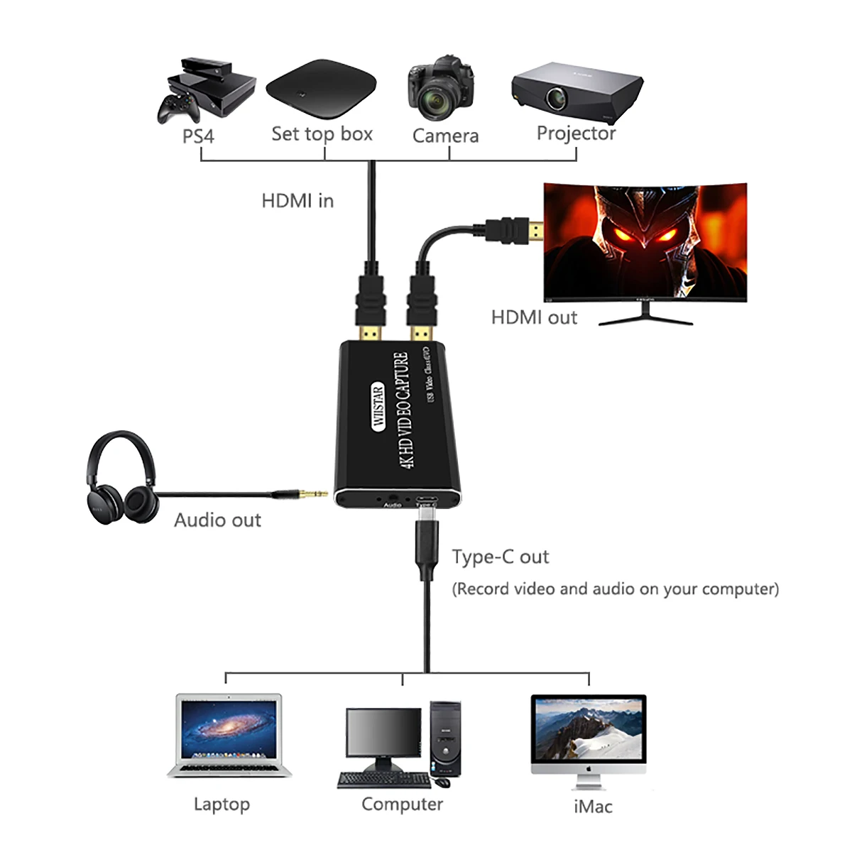 * Вход: HD * Выход: HD,type c ,audio * HD видео вход: 4K/30Hz HDMI HD Интерфейс * HD аудио вход: LPCM аудио сигнал * HD формат ввода: Поддержка мыши и клавиатуры через USB; 1.4A отвечающих требованиям, до 1080P/60 Гц 8-битный (RGB, YUV) * Частота кадров: 24/25/30/50/60 кадров в секунду * Выходное цветовое пространство: YUY2, RGB24 * Поддержка ОС: windows 7,8,10, для Mac OS X 10,9 или более поздней версии, Linux * Совместимость ПО: OBS Studio (для windows, OS X); Windows Media Encoder (для Windows); Для Adobe Flash Media Live - Encoder (для Windows, OS X); real Producer Plus (для Windows); VLC (для Windows, OS X, Linux); QuickTime broadcaser (OS X); QuickTime Player (OS X); Wirecast (для Windows,OS X); vMix (для Windows); Potplayer (для Windows) и т. Д. * Качество записи: максимум 1080p 30 кадров в секунду * Разрешение: до 4K(30 Гц)