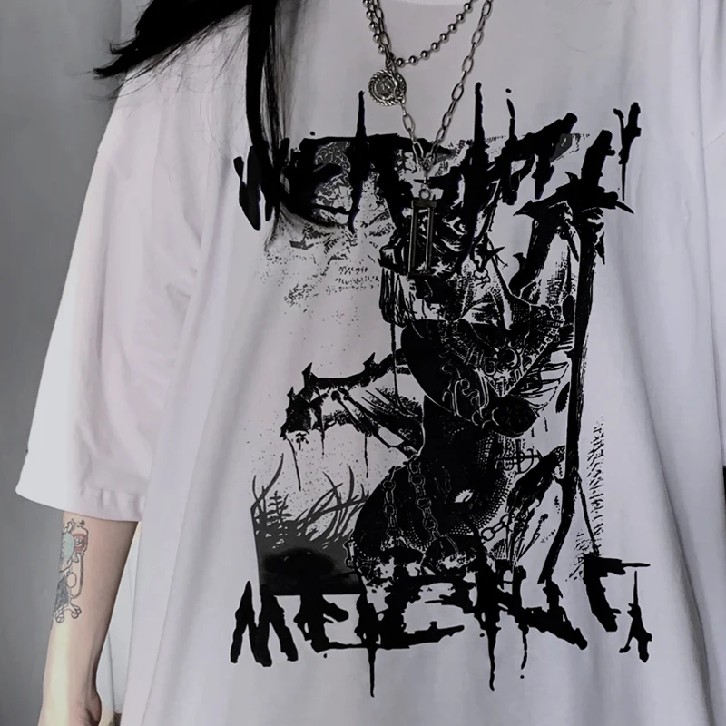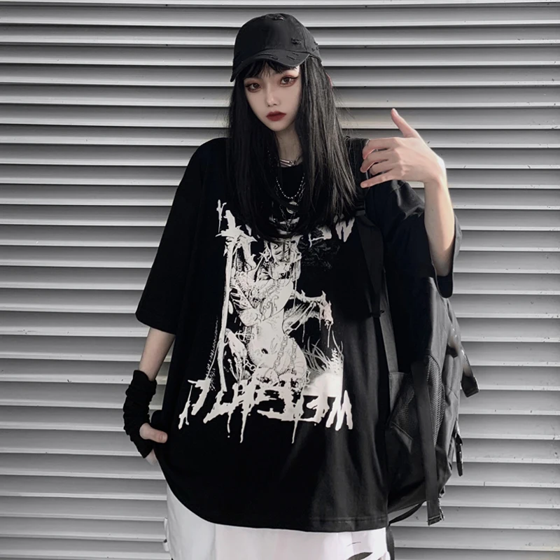 Женская футболка с короткими рукавами, в готическом стиле, темно-Y2k, Свободный Топ в стиле ретро, в стиле Харадзюку, с рисунком аниме, Топ