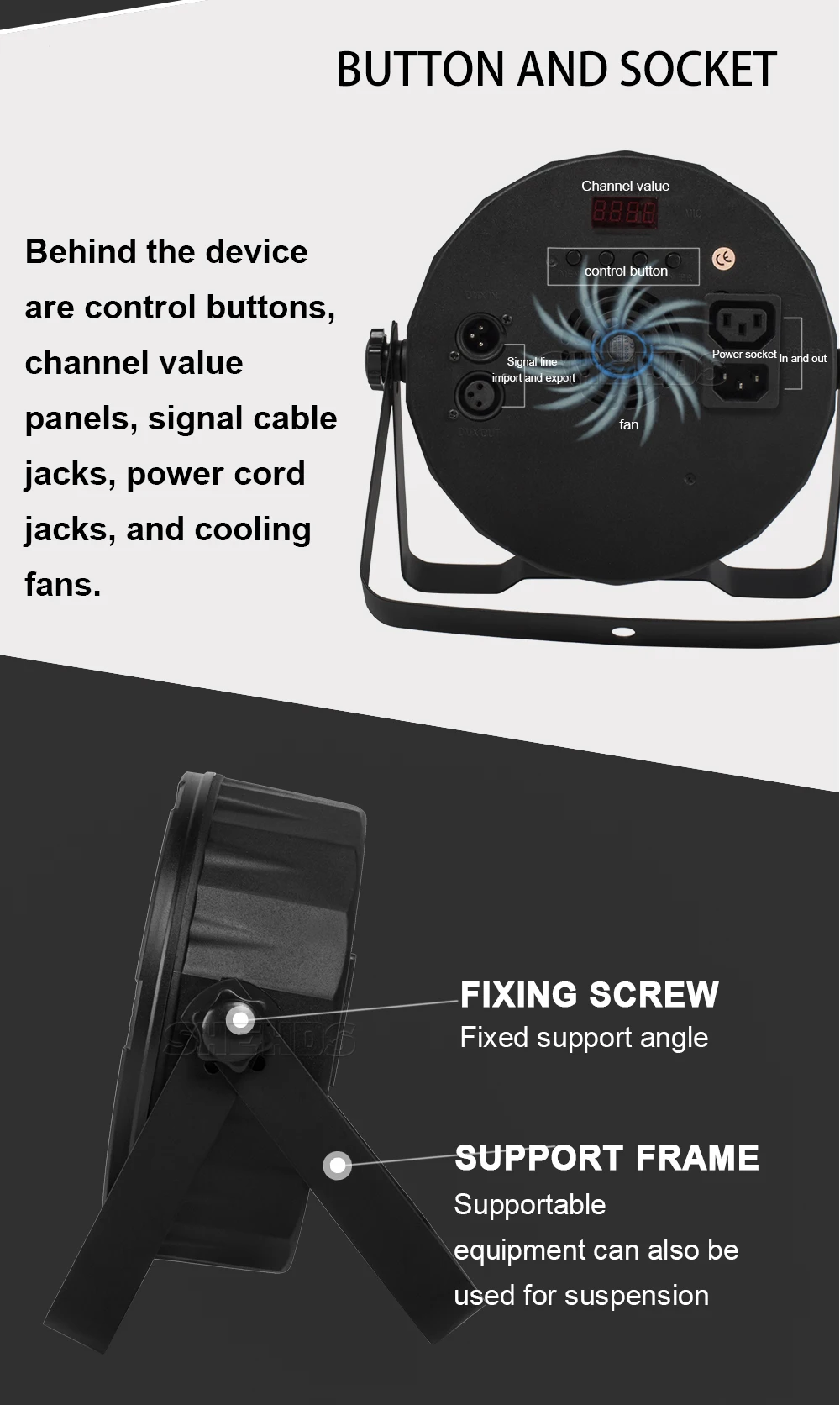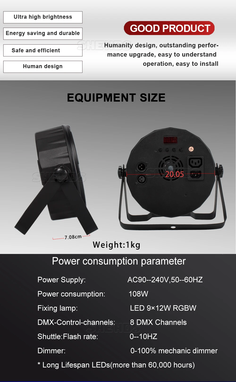 6. Режимы работы: DMX512,Auto Run,Sound action,Strobe,Stand 7.Alone и Master/Slave, с богатыми передовыми встроенными программами
