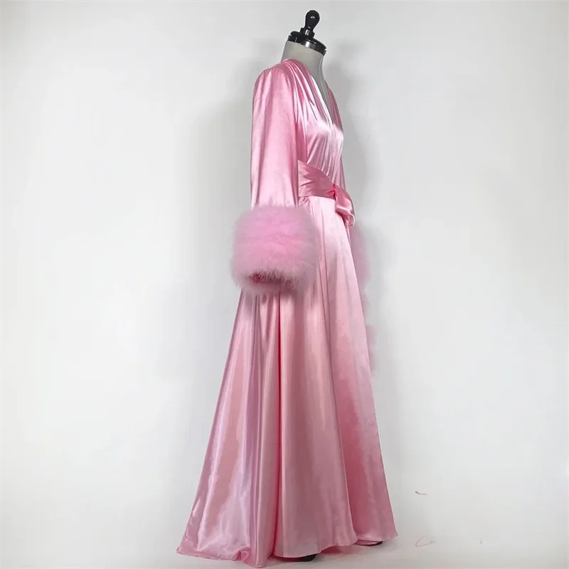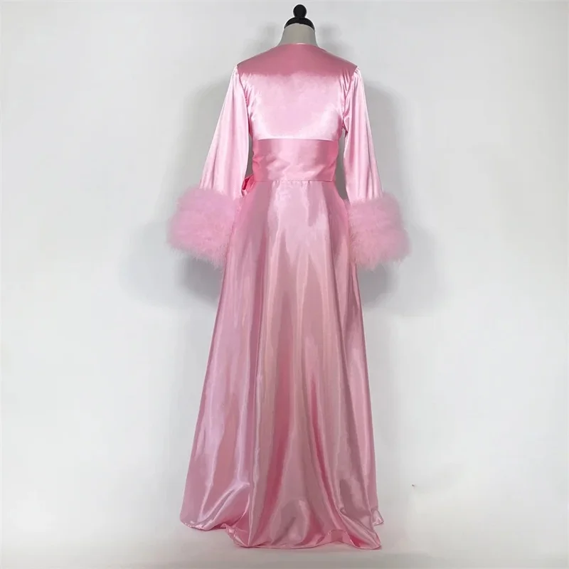 Женская пижама из мягкого шелка, розовая ночная рубашка с длинным рукавом и поясом, свадебная Пижама