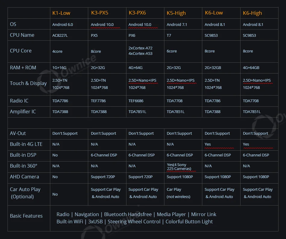K1-Low ------ AC8227L| Android 6,0 | 1G + 16GB | 2.5D + TN | Радио TDA7786 | Усилитель TDA7388K3-PX5 ------ PX5 | Android 10,0 | 2G + 32GB |2.5D + TN| Радио TDA7786 | Усилитель TDA7388К3-PX6------- PX6 | Android 10,0 | 4G + 64GB | 2.5D + Nano + IPS | Радио TEF6686 | Усилитель TDA7851LK5-High ------ T7 | Android 7,1 | 2G + 32GB | 2.5D + Nano + IPS | Радио TDA7708 | Усилитель TDA7851LK6-Low ------- SC9853 | Android 8,1 | 2G + 32GB | 2.5D + TN | Радио TDA7786 | Усилитель TDA7388K6-High ------ SC9853 | Android 8,1 | 4G + 64GB | 2.5D + Nano + IPS | Радио TDA7708 | Усилитель TDA7851L