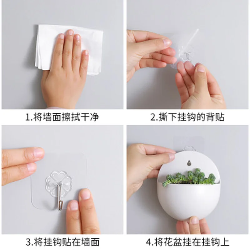 Способ установки: 1. Протрите стену чистой. 2. Оторвите клей на задней части крючка и приклейте его к стене. 3. Нажмите на крючок, чтобы выжать воздух. 4. Повесьте цветочный горшок на крючок