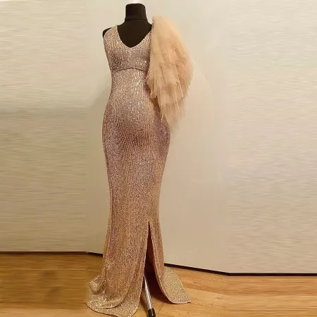 Женское вечернее платье-русалка, золотистое вечерние с рукавами-кры...