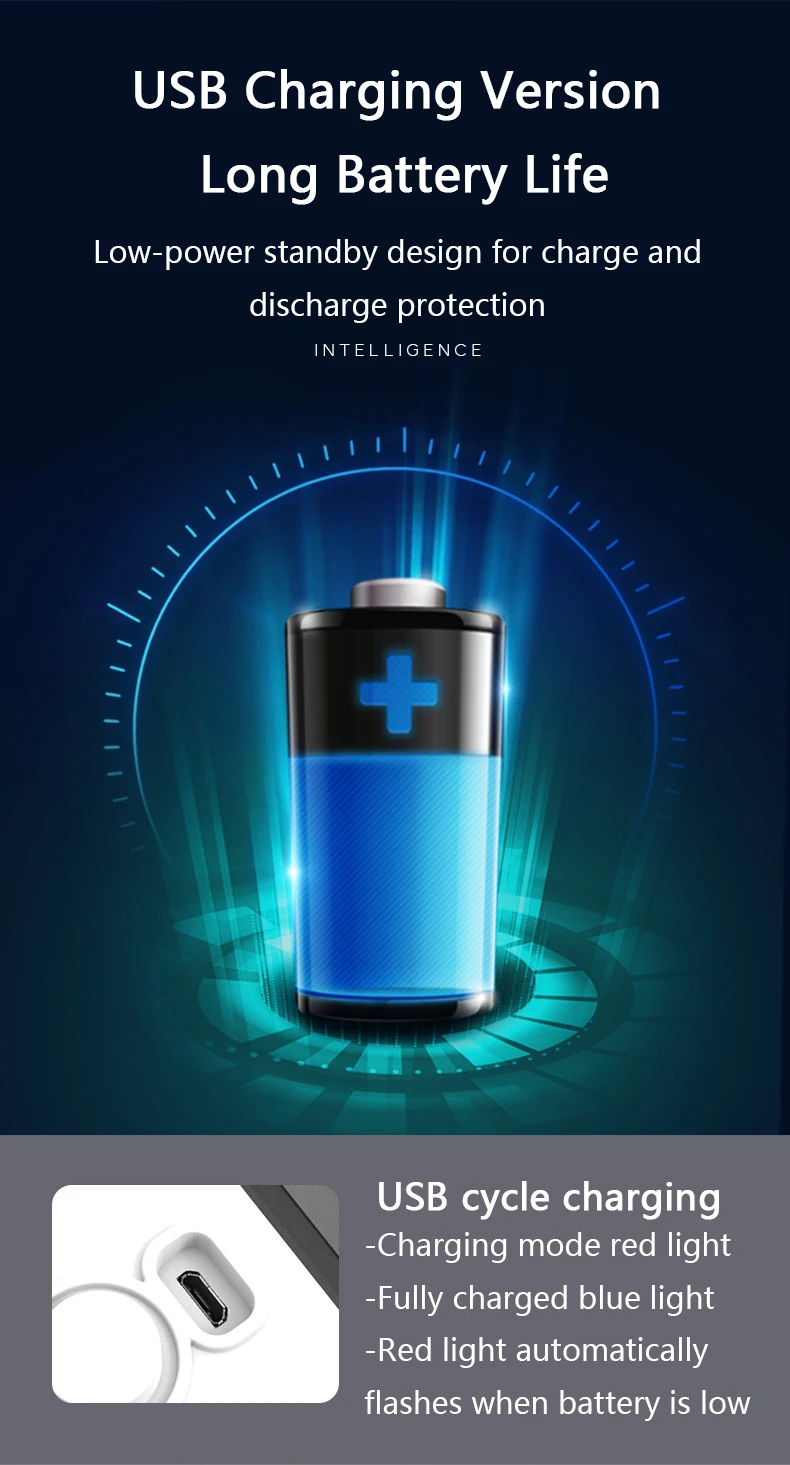 2. Зарядка через USB: режим зарядки красный светильник; Полностью заряженный синий светильник; Красный светильник автоматически мигает при низком заряде батареи.