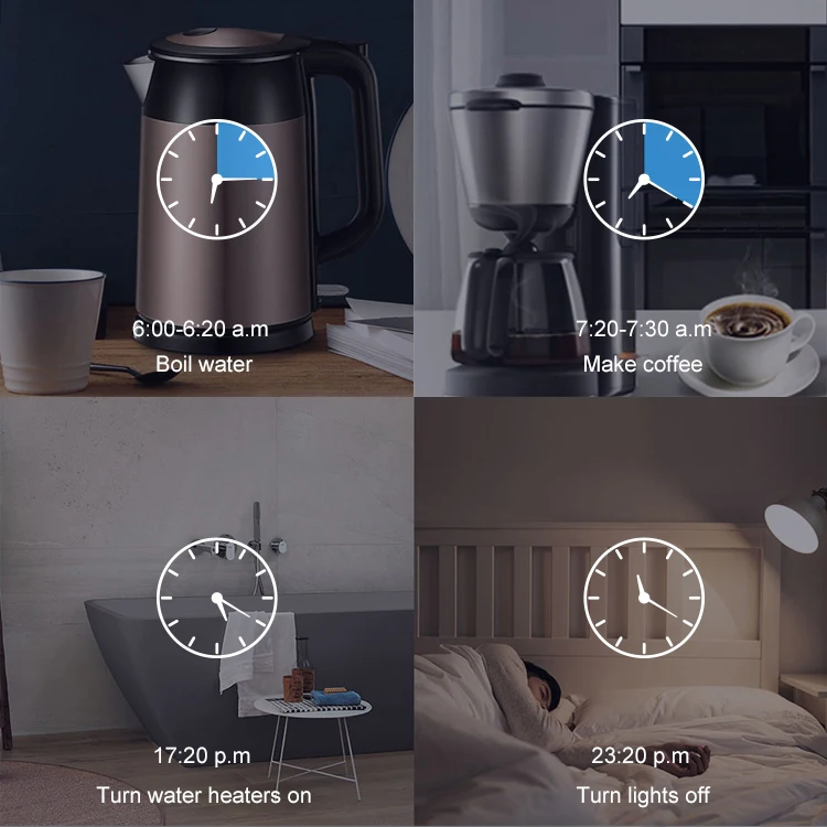 Вы можете спроектировать и установить определенныйВремя для автоматического включения/выключения домашнего прибора в гостиной, кухне, спальне или ванной комнате, что помогает экономить электроэнергию.