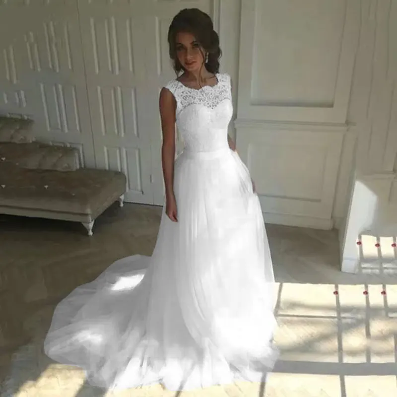 Кружевное атласное свадебное платье VENSANAC с круглым вырезом и ап...