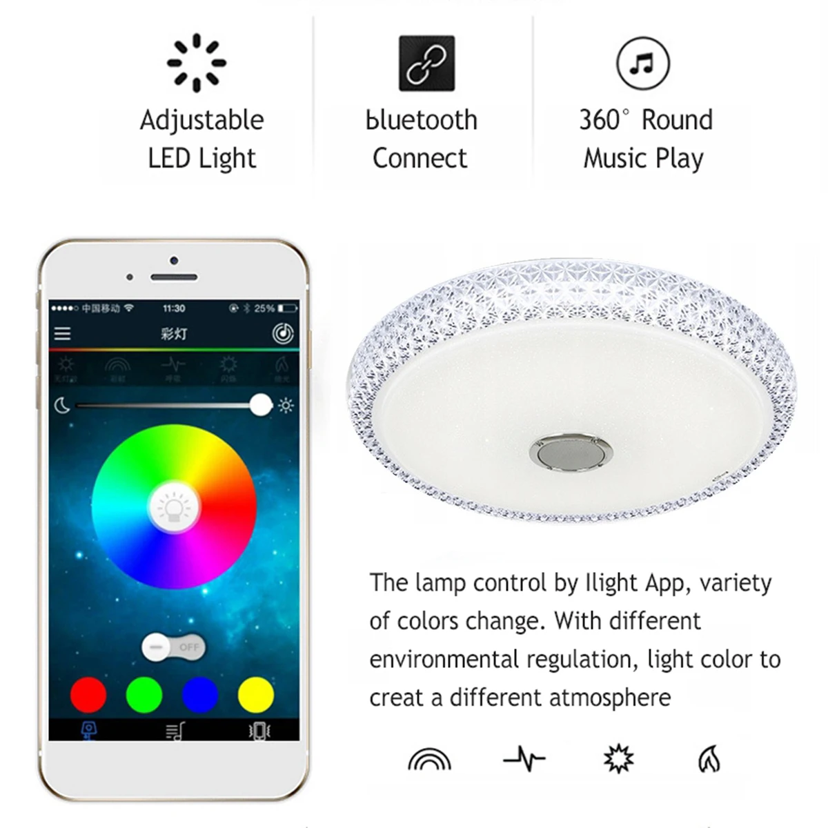 -Он оснащен мощным динамиком, который воспроизводит музыку через bluetooth-соединение со смартфона. С помощью специально разработанного приложения светильник со смартфона может управлять цветом и яркостью лампы.
