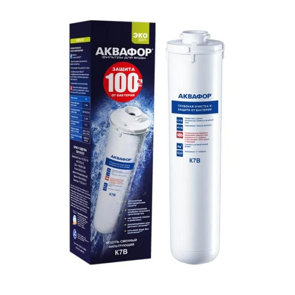 Модуль сменный фильтрующий АКВАФОР К7В И9385Сменный модуль K7B. Сменный модуль глубокой очистки воды для питьевых стационарных систем ''Кристалл''.Легкая замена сменного модуля. Удаляет бактерии, хлор, растворенное железо, фенол, пестициды, тяжелые металлы, хлорорганические соединения, частицы размером до 0,1 мкм.Изготовлен по технологии карбонблок с волокном ''Aqualen''. Половолоконная мембрана японского производства отсекает все бактерии на 100 %. Подходит для систем типа Кристалл.