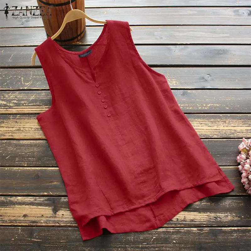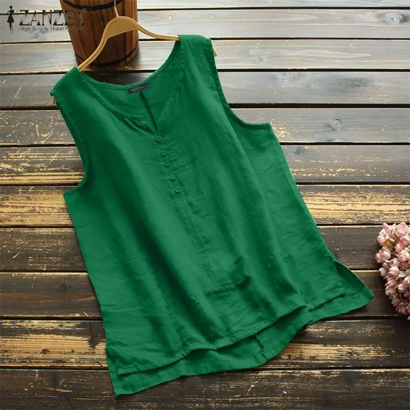 Блузка ZANZEA хлопковая в винтажном стиле, женские майки, топы Однотонная рубашка без рукавов, Повседневная свободная туника с разрезом на подоле, на лето