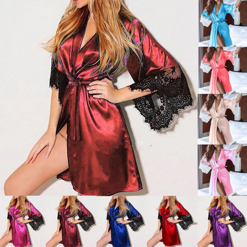 Женский сексуальный Шелковый Атласный халат-кимоно, кружевное нижнее белье, боди, одежда для сна с поясом, банный халат, женская одежда для сна, женский халат