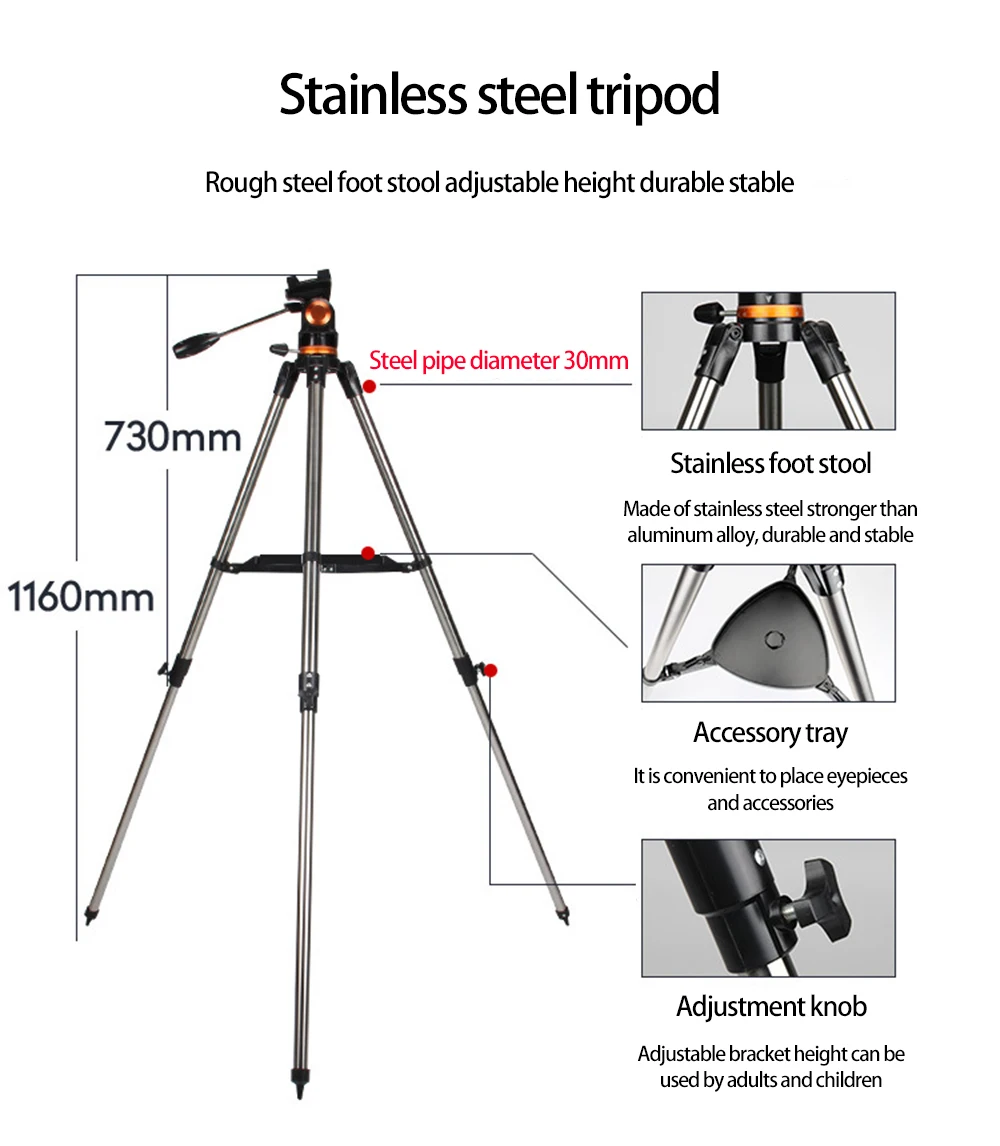 1. Высококачественный алюминиевый сплав: вам не придется беспокоиться о поломке2. Красивый внешний вид больше подходит, чтобы стимулировать интерес детей3. Один год гарантии4. У нас есть видео установки, легко установить5. Бесплатный мобильный телефон-держатель, так что вы можете использовать свой мобильный телефон для записи красоты звезд
