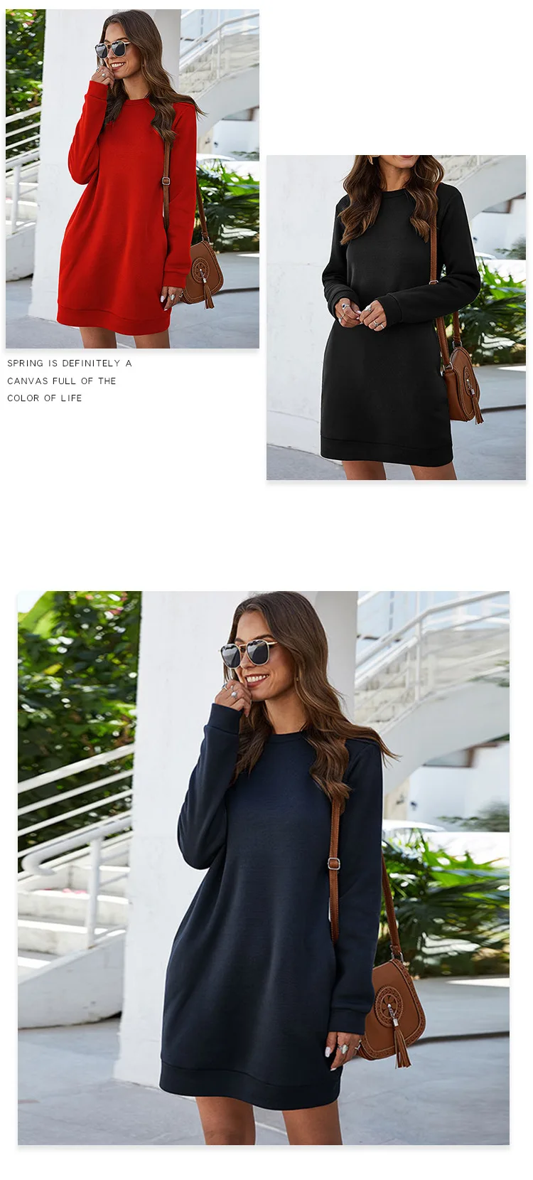 Женское платье-свитшот с круглым вырезом и длинным рукавом, однотон...