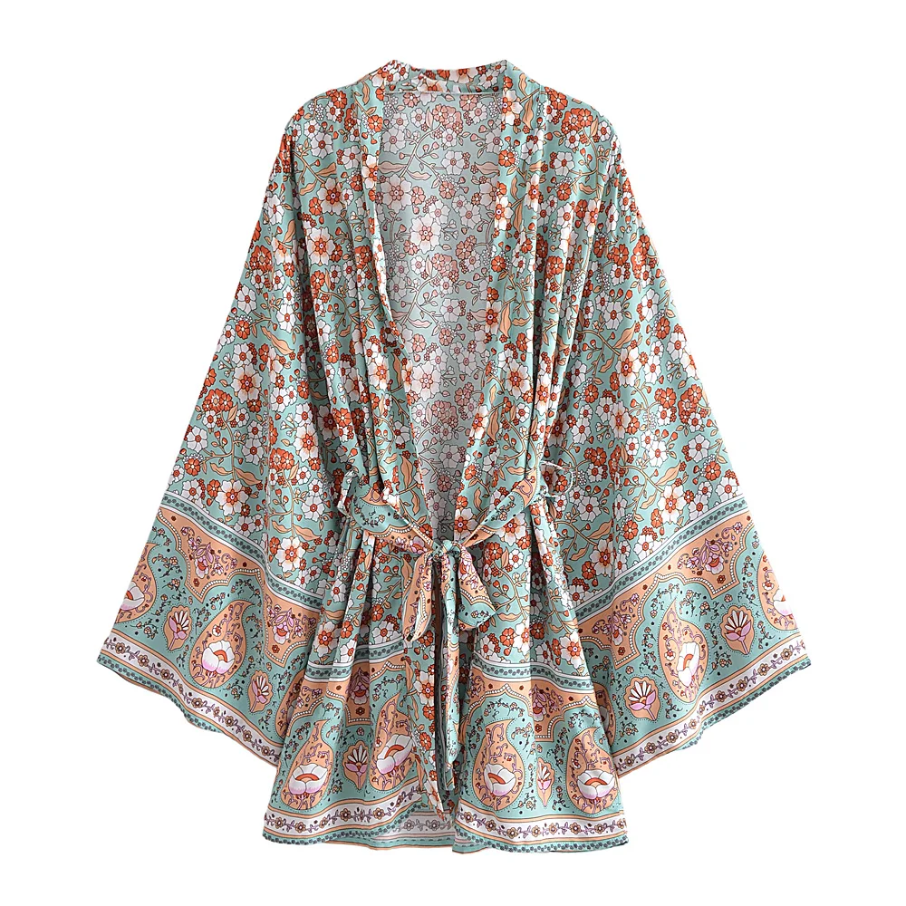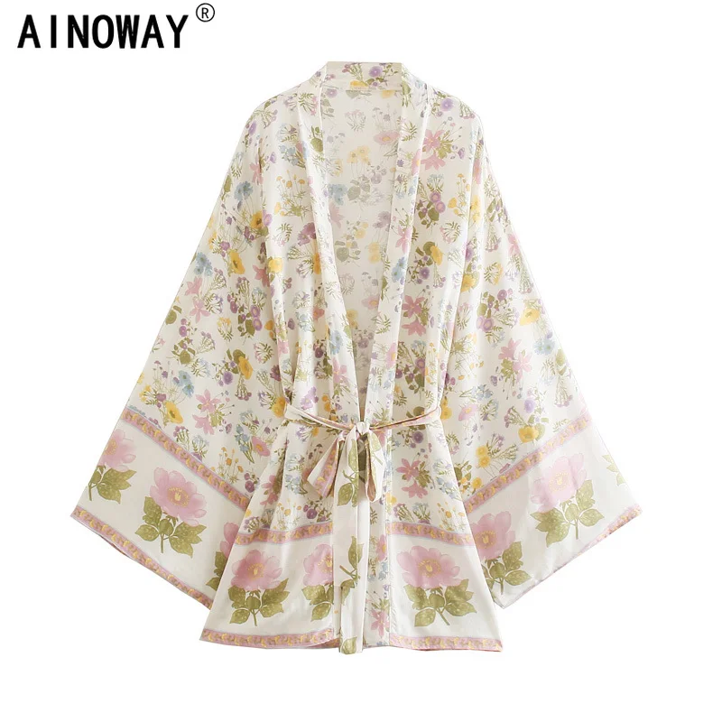Женское винтажное кимоно с цветочным принтом, V-образным вырезом и рукавами летучая мышь