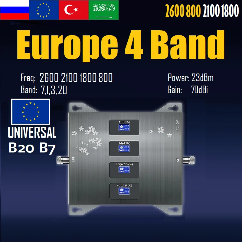 Ретранслятор 4G LTE + 800 1800 2600 МГц 3G 2100 4 диапазона Усилитель B20 B3 B1 B7 поддержка 4 внутренних антенн