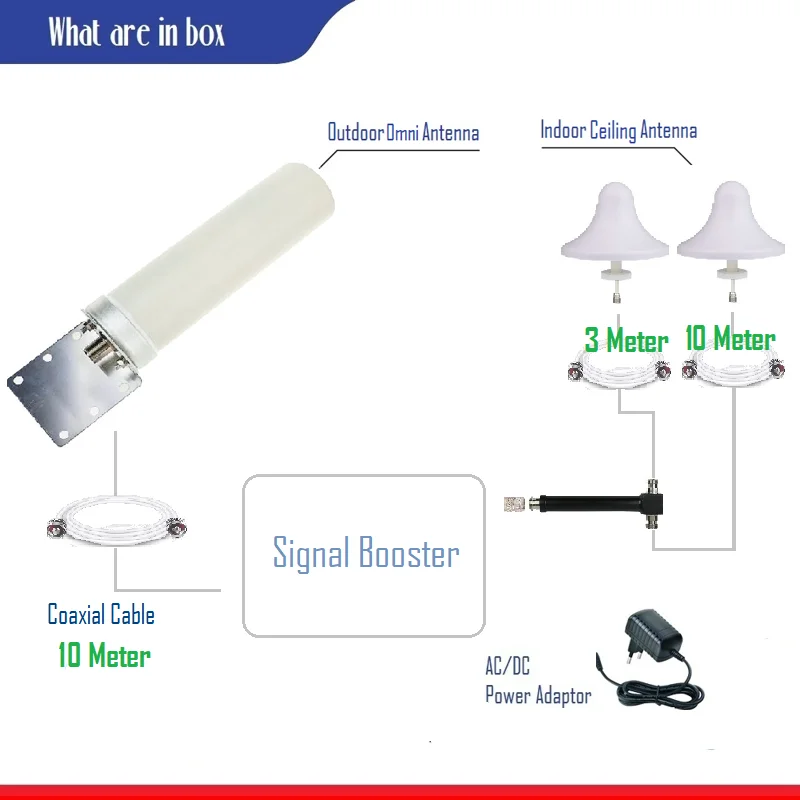 13 м Omni 1 потолок:1 усилитель (адаптер переменного/постоянного тока европейского стандарта) 1 шт.2-наружная всенаправленная антенна 1 шт3-комнатная потолочная антенна 1 шт.4-Coxial кабель 10 метров 1 шт5-Coxial кабель 3 метра 1 шт23 м OMNI 1 потолок:1 усилитель (адаптер переменного/постоянного тока европейского стандарта) 1 шт.2-наружная всенаправленная антенна 1 шт3-комнатная потолочная антенна 1 шт.4-Coxial кабель 20 метров 1 шт5-Coxial кабель 3 метра 1 шт23 м OMNI 2 потолок1 усилитель (адаптер переменного/постоянного тока европейского стандарта) 1 шт.2-наружная всенаправленная антенна 1 шт3-комнатная потолочная антенна комплект из 2 предметов4-Coxial кабель 10 метров 1 шт5-Coxial кабель 10 м 1 шт 3 м 1 шт6-1-2 сплиттера 1 шт7-N мост между усилителем и сплиттером 1 шт30 м OMNI 2 потолок1 усилитель (адаптер переменного/постоянного тока европейского стандарта) 1 шт.2-наружная всенаправленная антенна 1 шт3-комнатная потолочная антенна комплект из 2 предметов4-Coxial кабель 20 метров 1 шт5-Coxial кабель 5 метров 2 шт или 10 м 1 шт 3 м 1 шт6-1-2 сплиттера 1 шт7-N мост между усилителем и сплиттером 1 шт50 м Omni 4 потолок1 усилитель (адаптер переменного/постоянного тока европейского стандарта) 1 шт.2-наружная всенаправленная антенна 1 шт3-комнатная потолочная антенна 4 шт.4-Coxial кабель 20 метров 1 шт5-Coxial кабель 10 метров 2 шт6-Coxial кабель 5 метров 2 шт7-1 до 4 сплиттер 1 шт8-N мост между усилителем и сплиттером 1 штТолько усилитель1 усилитель (адаптер переменного/постоянного тока европейского стандарта) 1 шт.