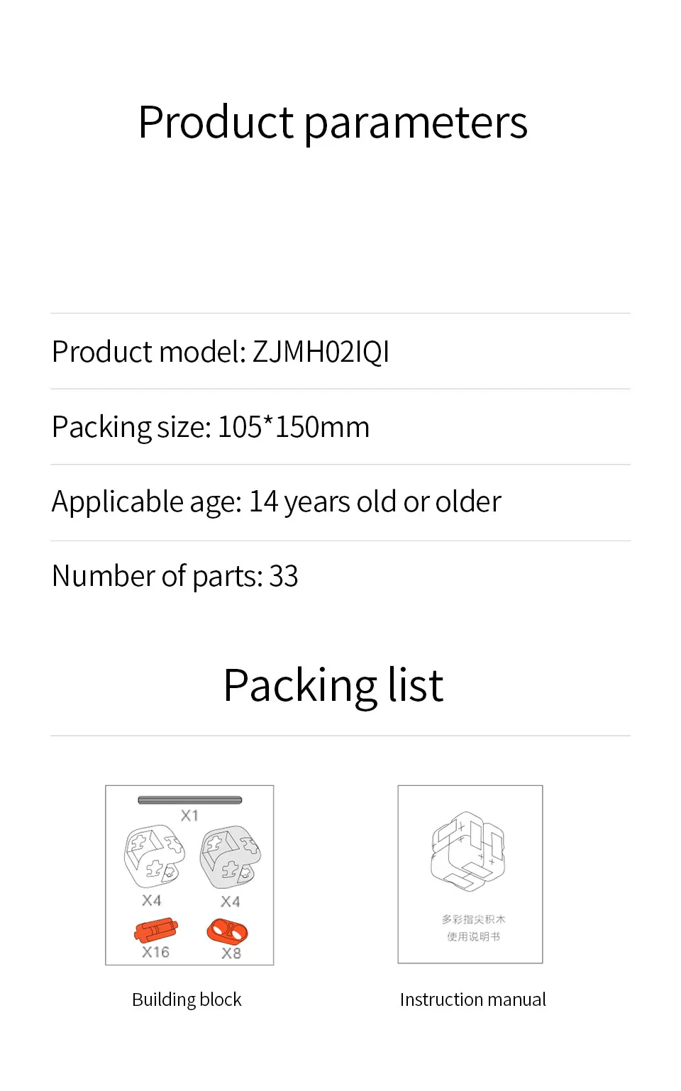 ● Модель изделия: ZJMH02IQI● Количество деталей: 33 шт.● Возраст использования: 14 + лет● Размер упаковки: 105*150 мм