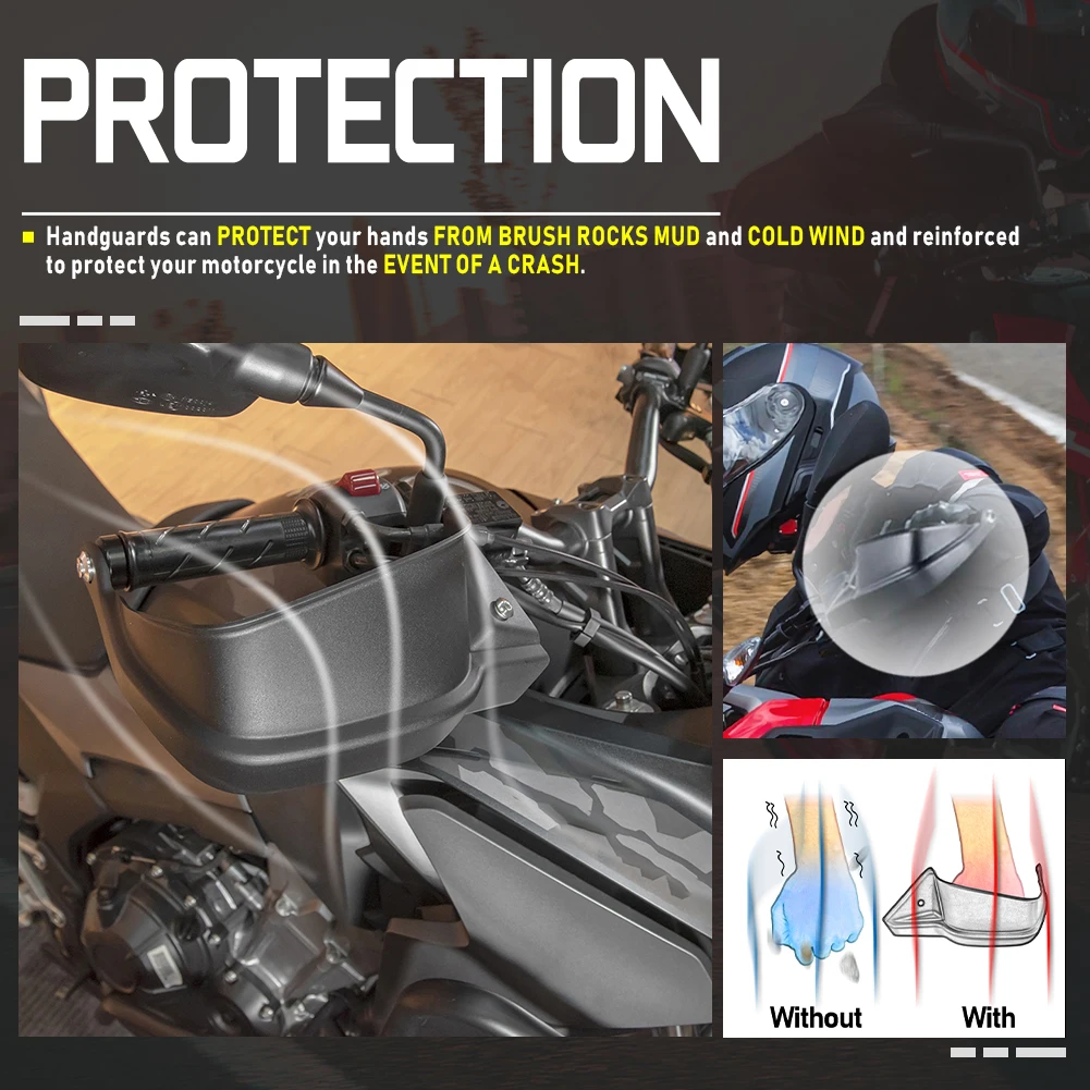 -Эффективно защищает руки во время вождения-Уменьшает усталость рук или пальцев-Защитите руки от кистей, камней, грязи и холодного ветра-С достаточным eoom для управления тормозными кабелями и другими устройствами-Простота установки с инструкцией по установке