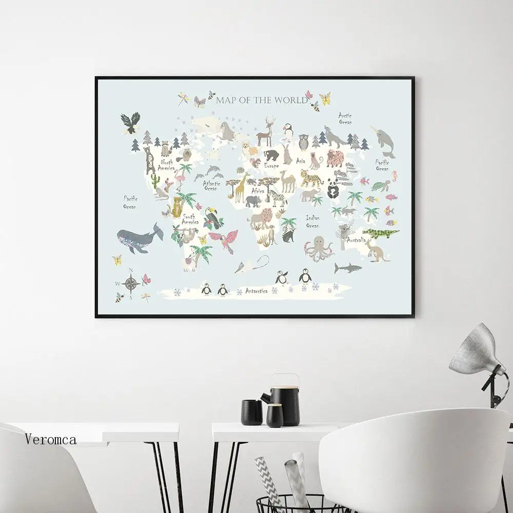 Декор детской комнаты, постер, Карта мира с животными, Детская Настенная картина на холсте, Скандинавская Милая мультяшная картина, декор детской комнаты