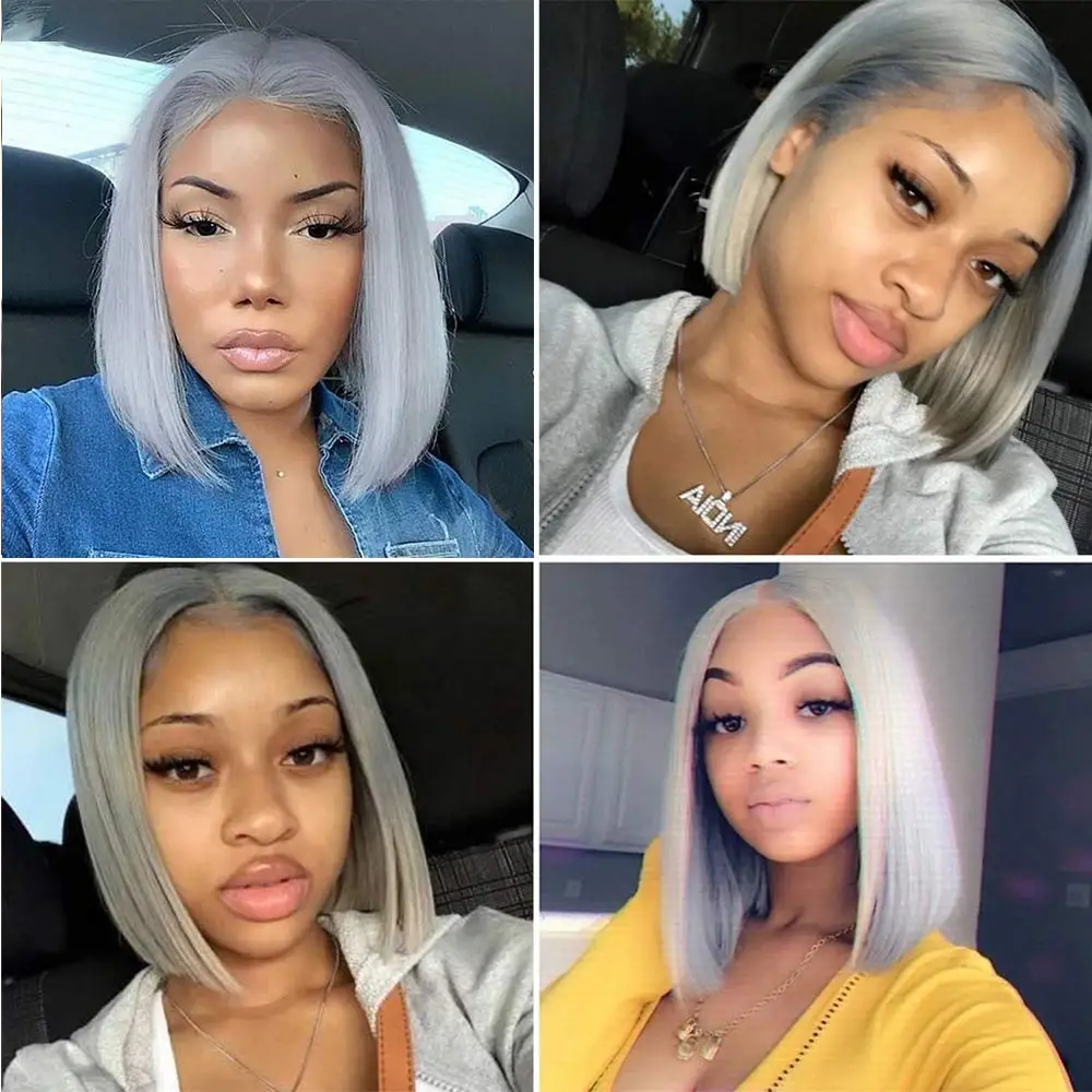 Grey None Lace Frontal Human Hair Bob WigGray Full Machine Made Human Hair Wig